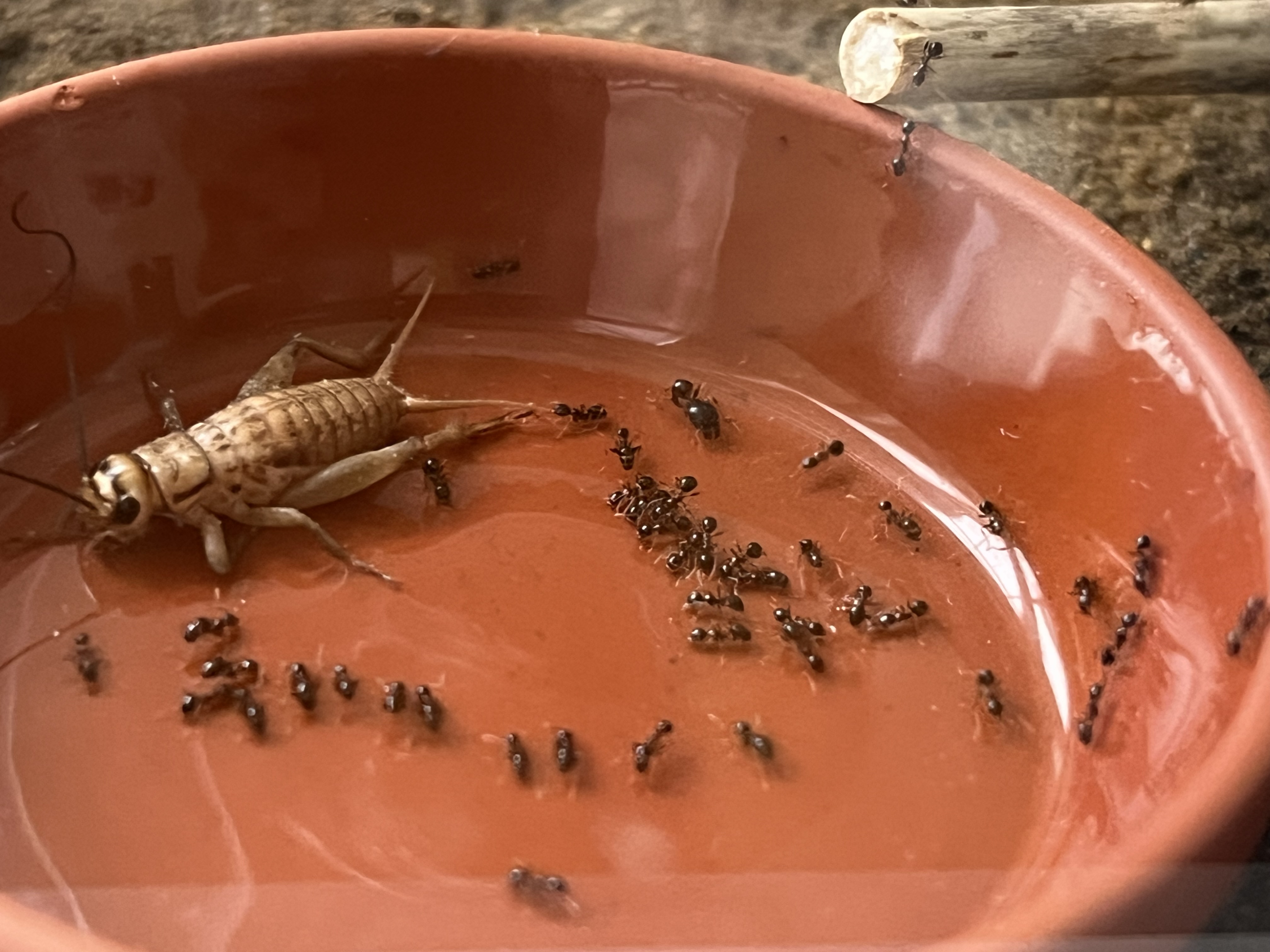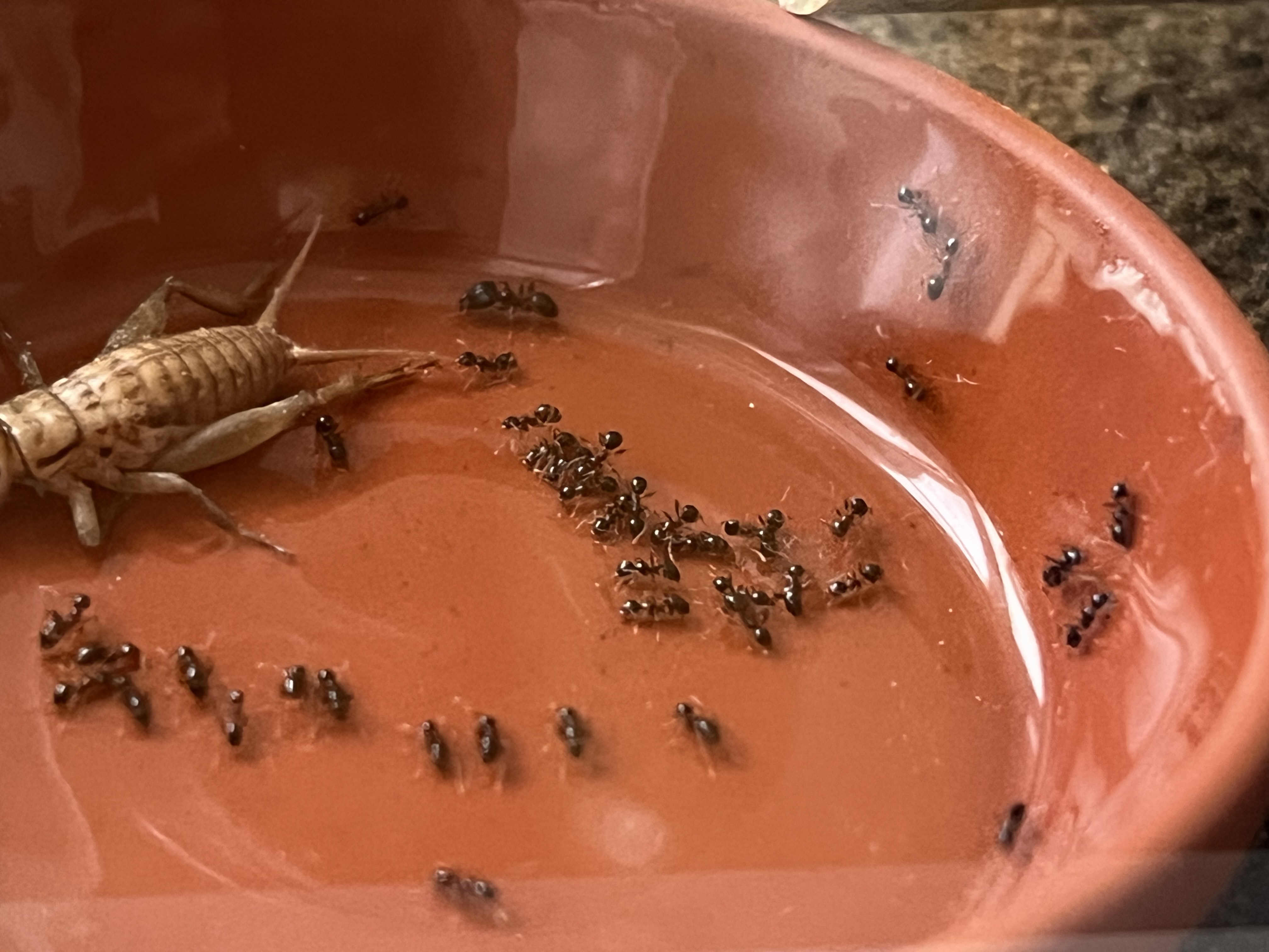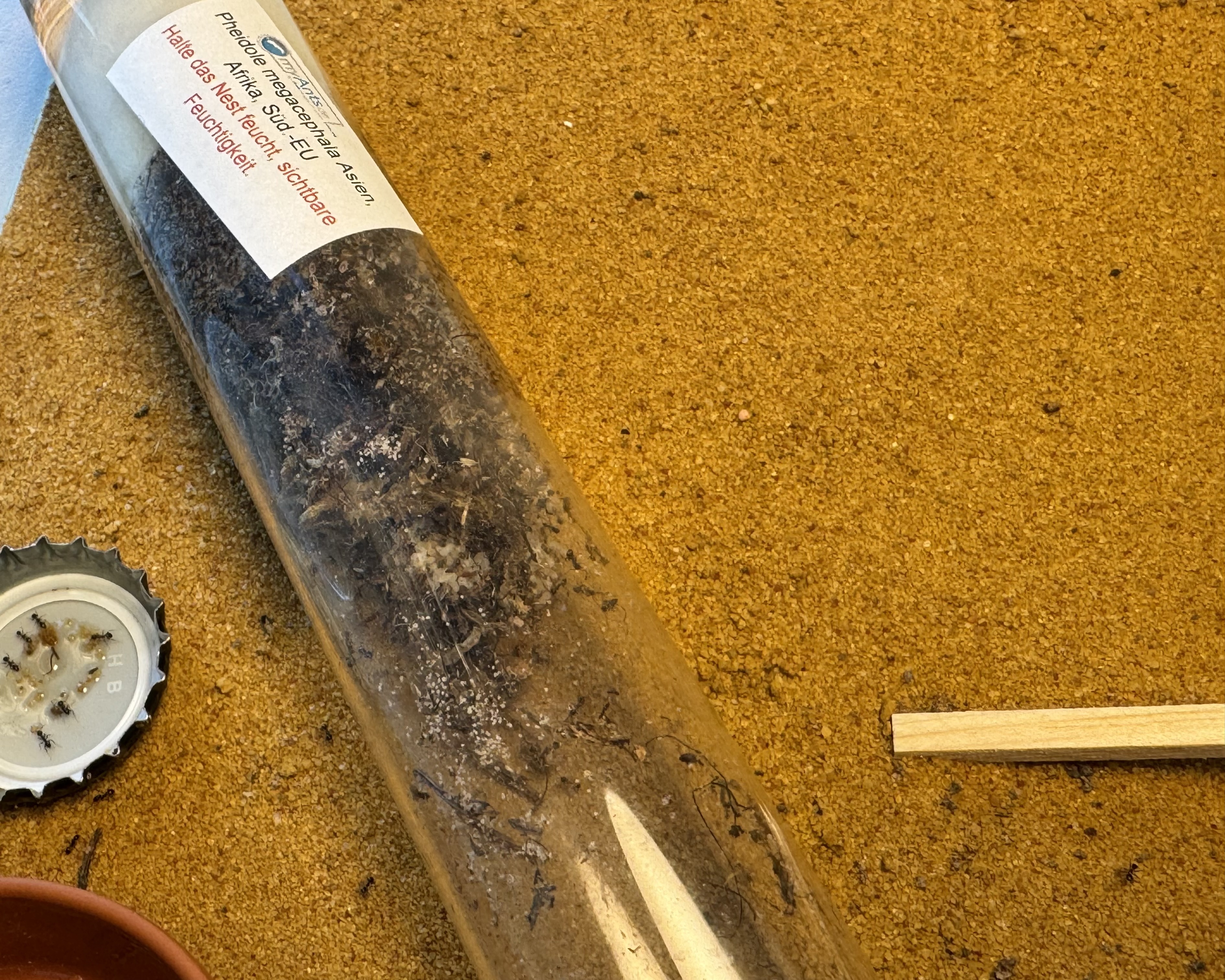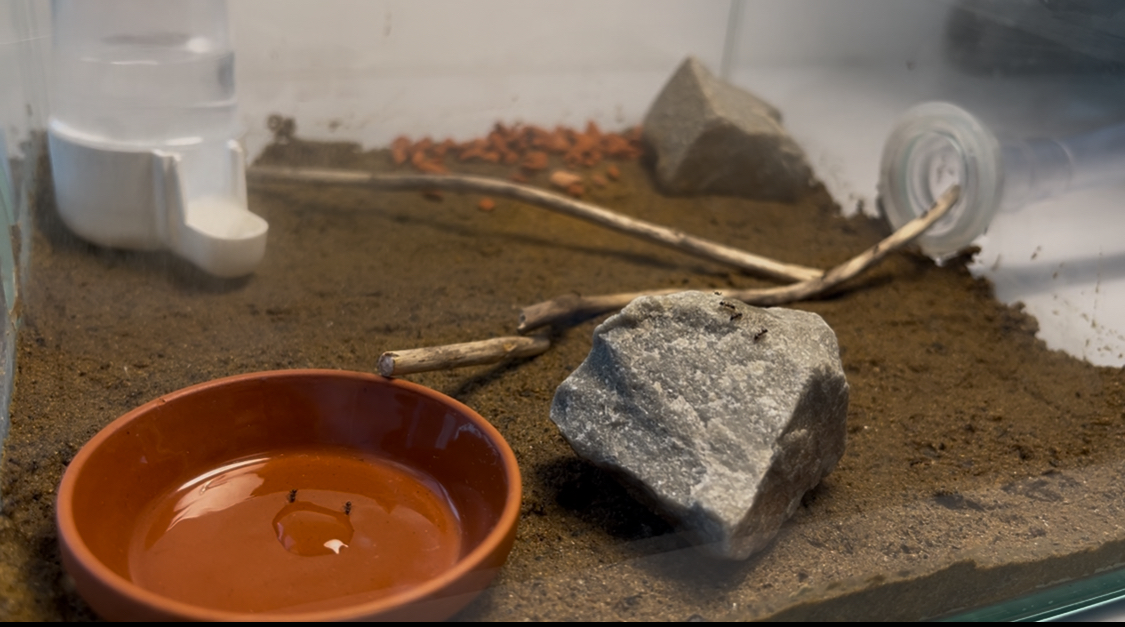 Da ich die Kolonie gerne mit Heimchen füttere, bin ich dann auch gestern mal zum Dehner in meiner Nähe gefahren und habe mich bei den Futtertieren umgeschaut. Ich hatte zuvor gelesen, dass besonders kleine Drosophila-Fliegen gerne genommen werden, also habe ich direkt eine Dose mitgenommen und ihnen ein paar angeboten. Was soll ich sagen: Sie haben sich regelrecht darauf gestürzt! Es war wirklich beeindruckend zu beobachten.