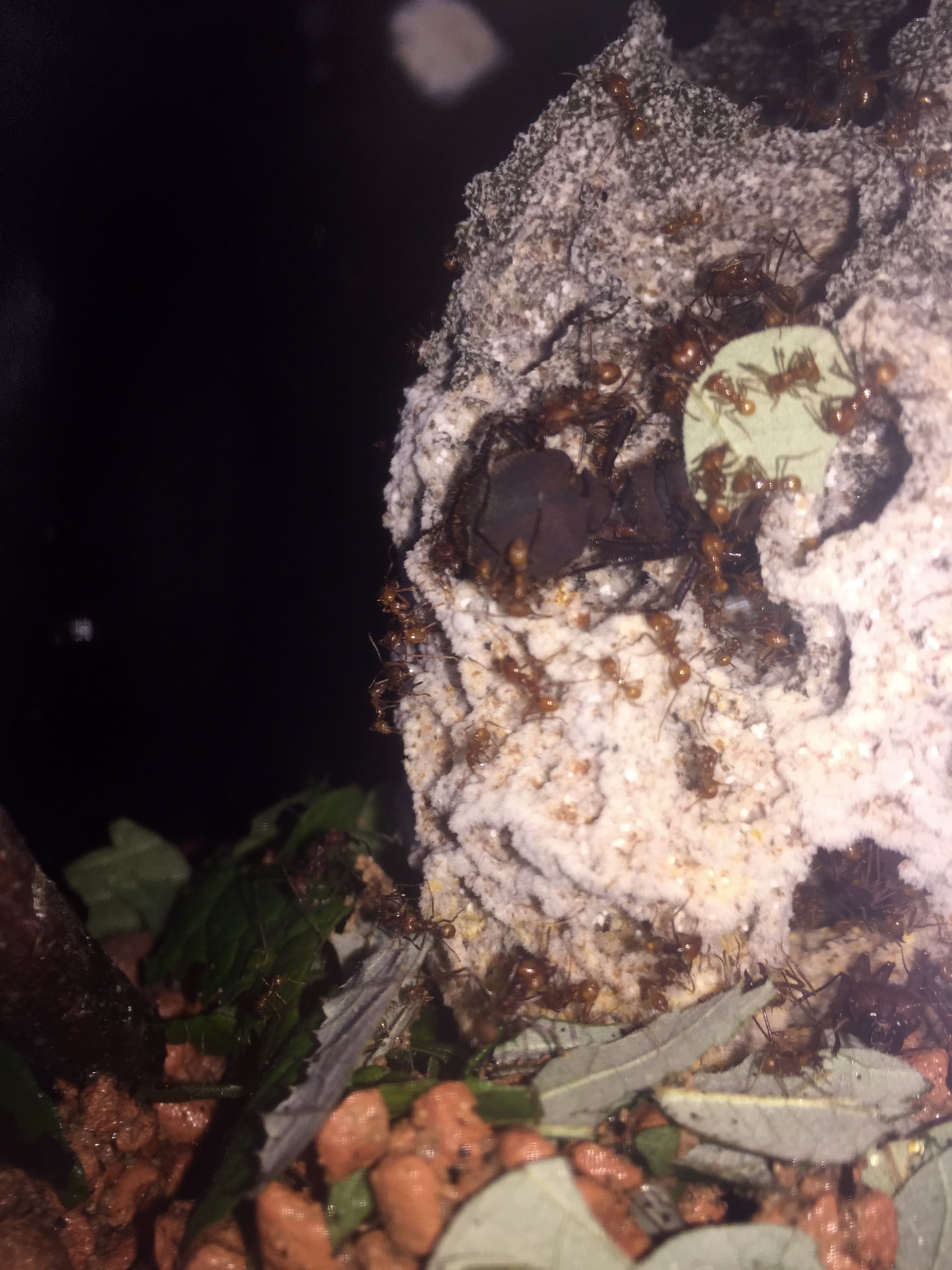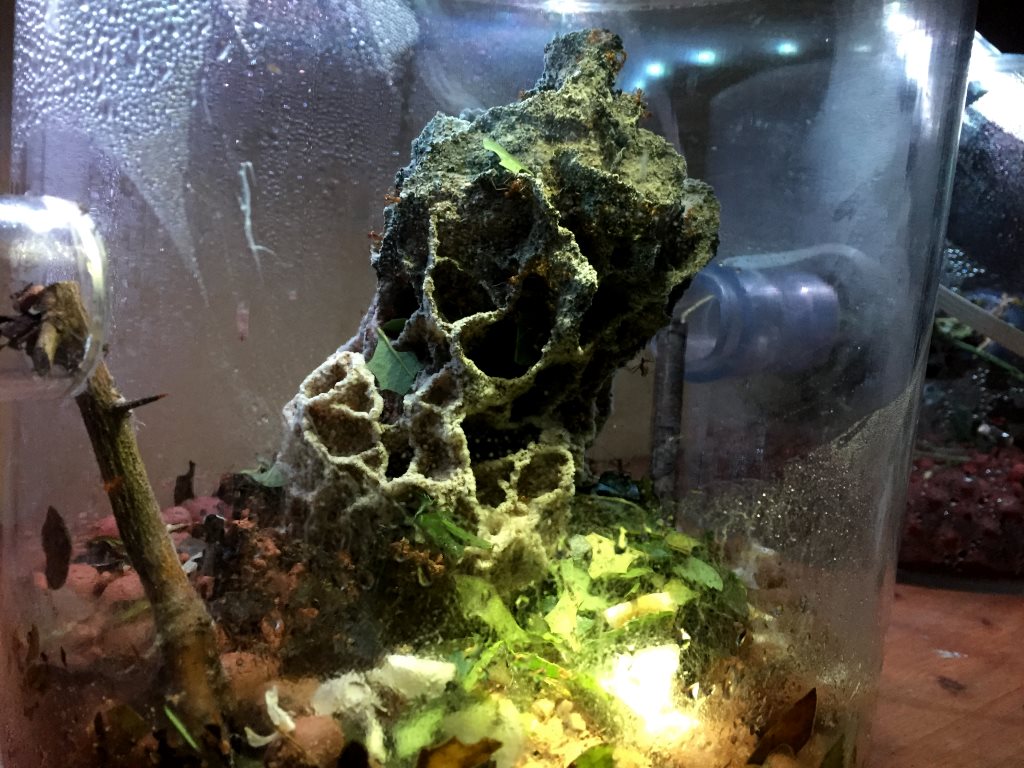 Wie so üblich, hatten sie den Eingang zur Pilzabdeckung nach ihren Vorstellungen gestaltet. Leider hatten sie als Baumaterial auch Blätter und Blättermüll verwendet, was dann weiter zu "Kompost" zerfallen ist - die Springschwänze im Becken haben sich gefreut - super Futter für sie: