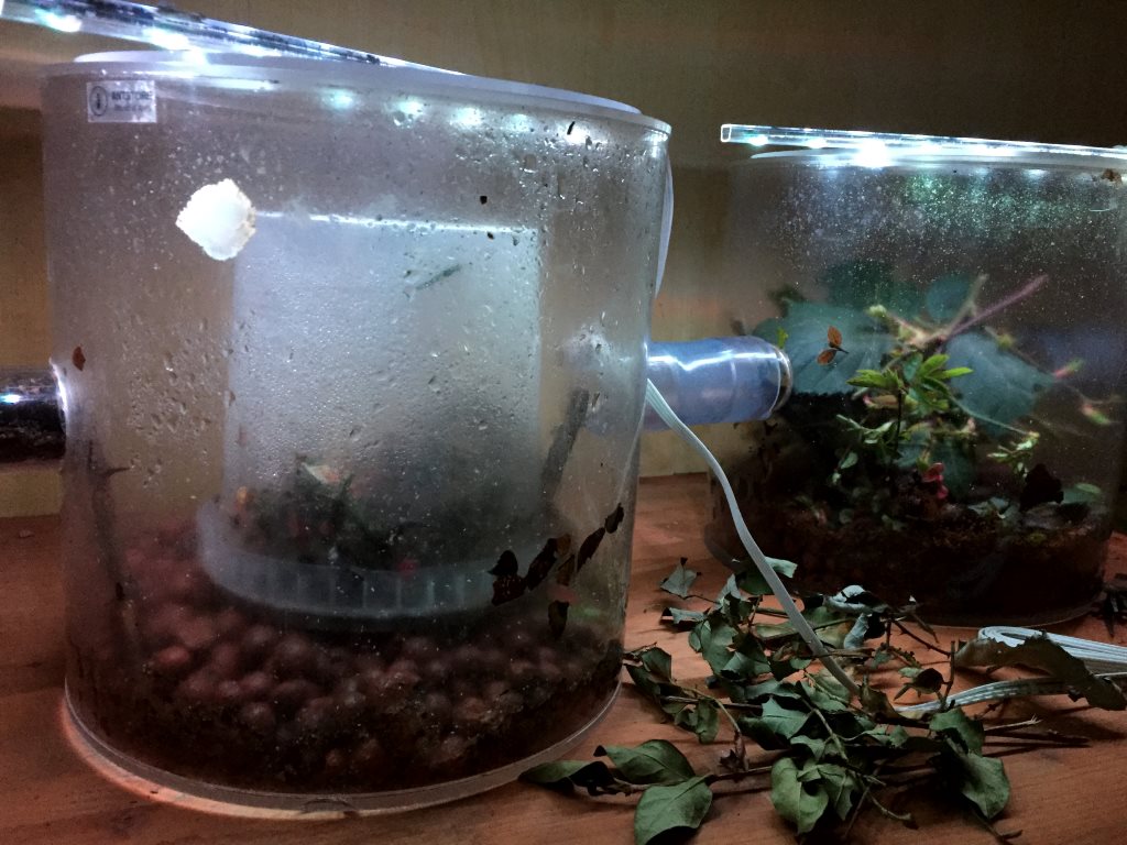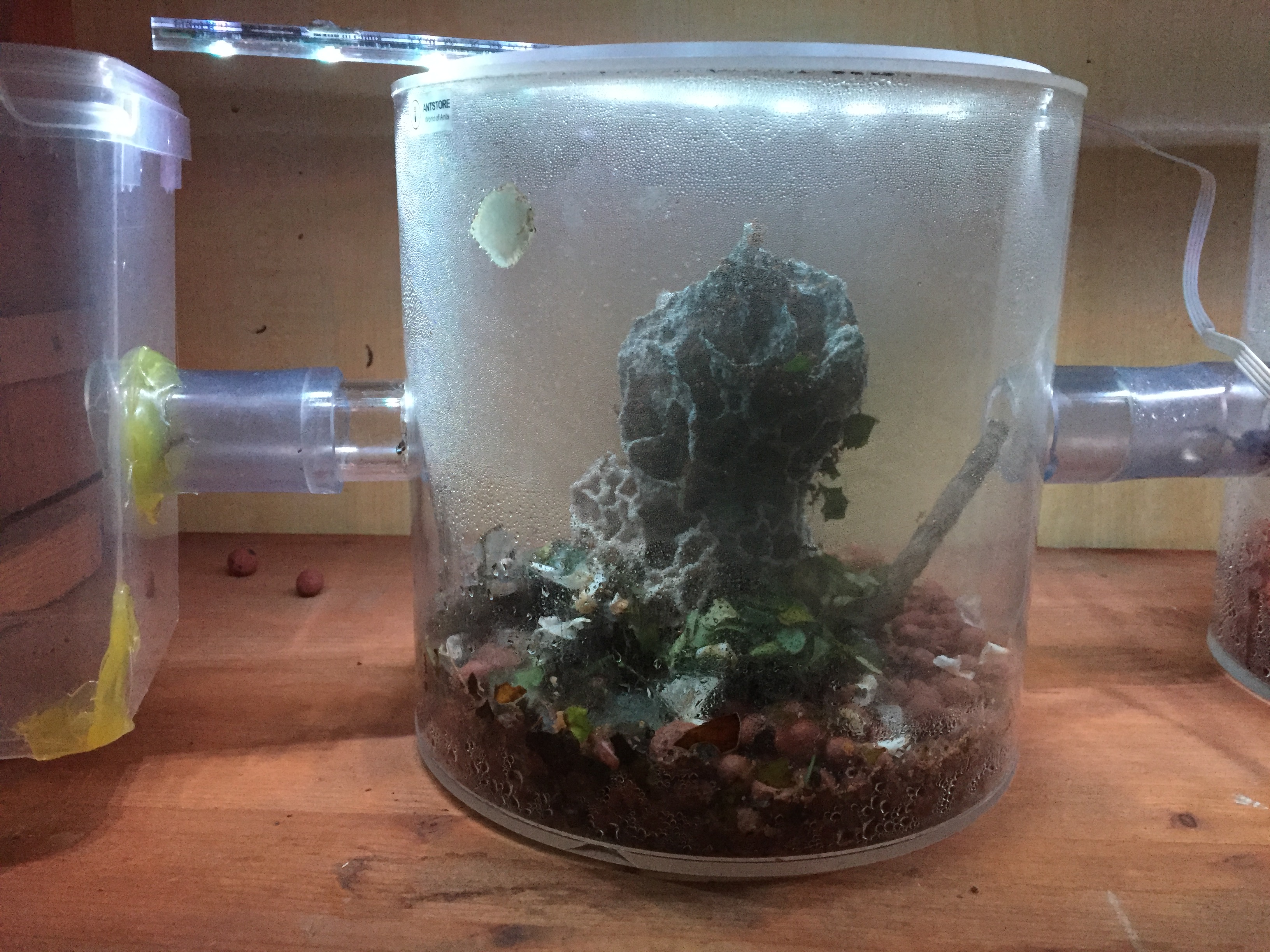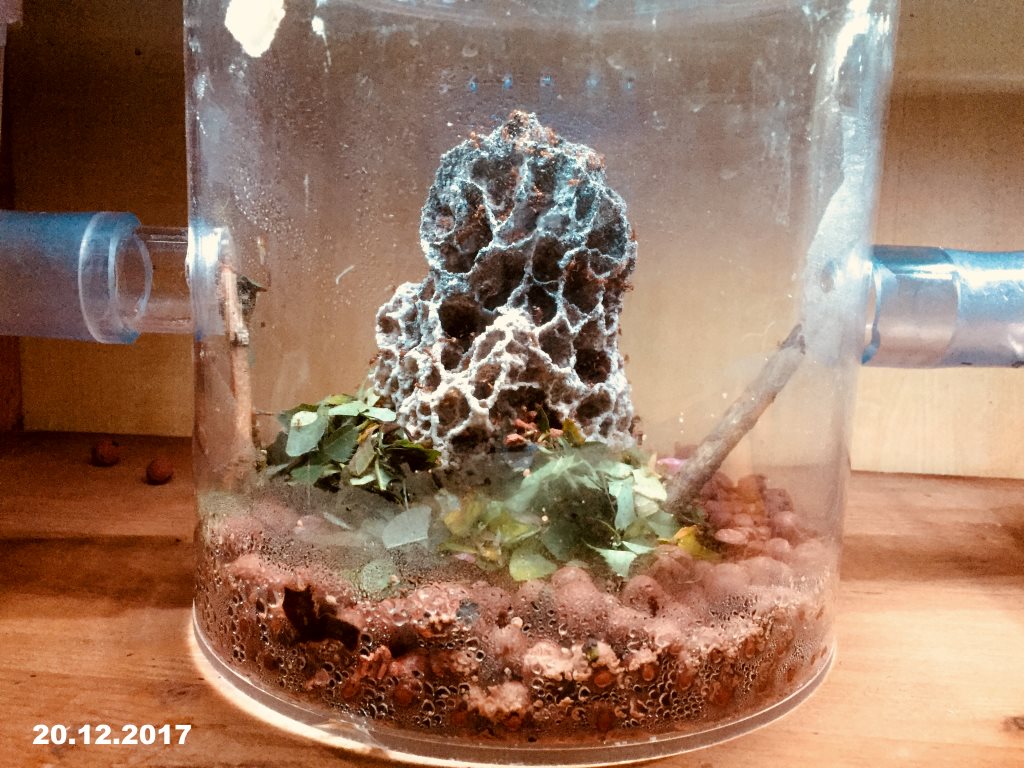 Hier hat sich auch ein Nachteil der Blähtonkugeln gezeigt: viele feuchte Hohlräume, welche einen super Lebensraum für Springschwänze darstellen. Zusammen mit den verrottenden Blättern + der hohen Luftfeuchtigkeit, war dies ein idealer Lebensraum für Springschwänze, die sich im Pilzbecken super vermehrt haben: