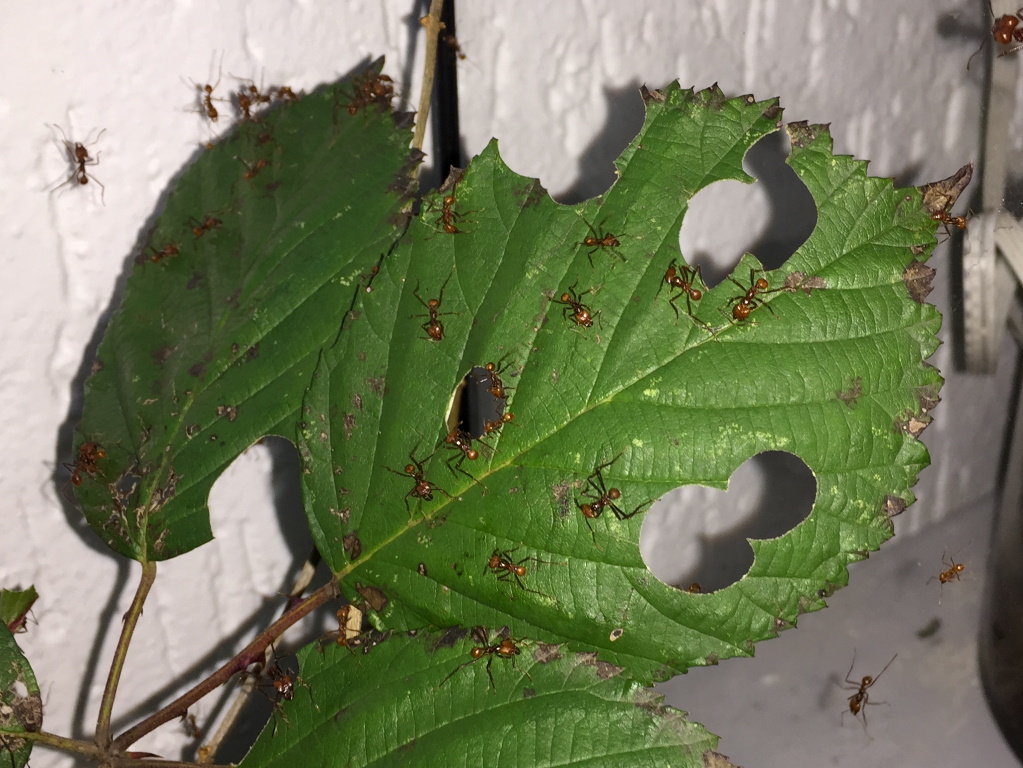 Hier sollte erwĂ€hnt werden, dass gerade kleine Kolonien am Anfang noch recht wĂ€hlerisch sind bzw. sein können. Und unterschiedliche Kolonien unterschiedliche âGeschmĂ€ckerâ haben können â das was die eine Kolonie gerne und willig schneidet, wird von der anderen ignoriert. Meine Atta cephalotes Kolonie hat z.B. lange Zeit RosenblĂŒtenblĂ€tter so gut wie komplett verschmĂ€ht, obwohl diese als Lieblingsfutter von Blattschneiderameisen gelten. Ab ca. einem Liter Pilz wird das besser, sprich wenn sie langsam mehr Futter brauchen, nehmen sie auch mehr verschiedene Pflanzen. Was auch logisch ist: Neue Futterpflanzen bergen das Risiko, dass der Pilz sie nicht mag oder vertrĂ€gt. Also erst Mal bei bisher bewĂ€hrtem bleiben, spĂ€ter bei höherem Bedarf probieren sie dann neue Pflanzen. Die Ameisen âentscheidenâ zusammen mit dem Pilz, ob das was sie schneiden vertrĂ€glich fĂŒr ihn ist. Pilz und Ameisen kommunizieren miteinander.
