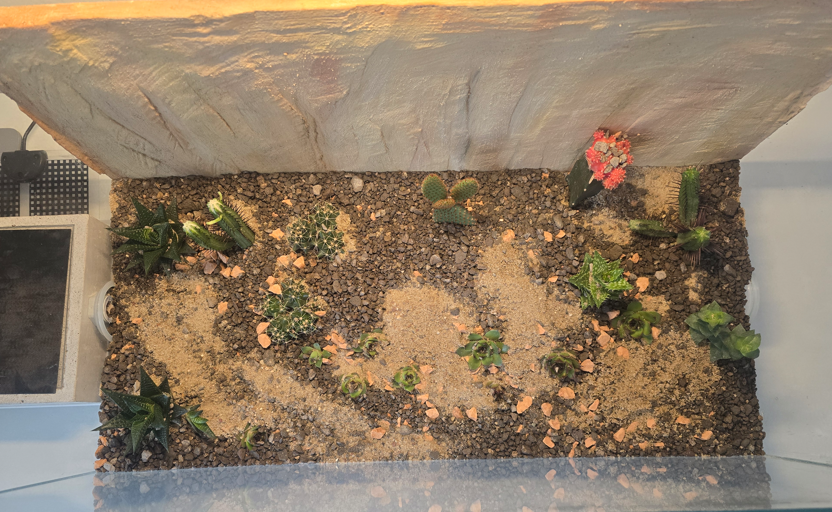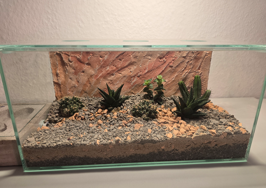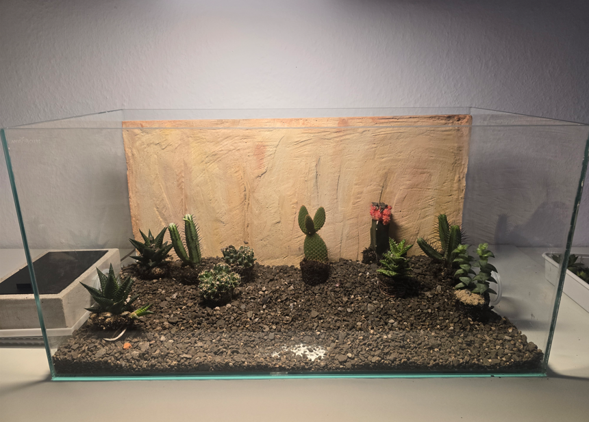 Das gilt nicht nur für das Granulat, beziehungsweise den Boden - sondern auch für die Pflanzen und Pflanzengröße. Am Ende machen Hölzer und Deko-Artikel im Hintergrund