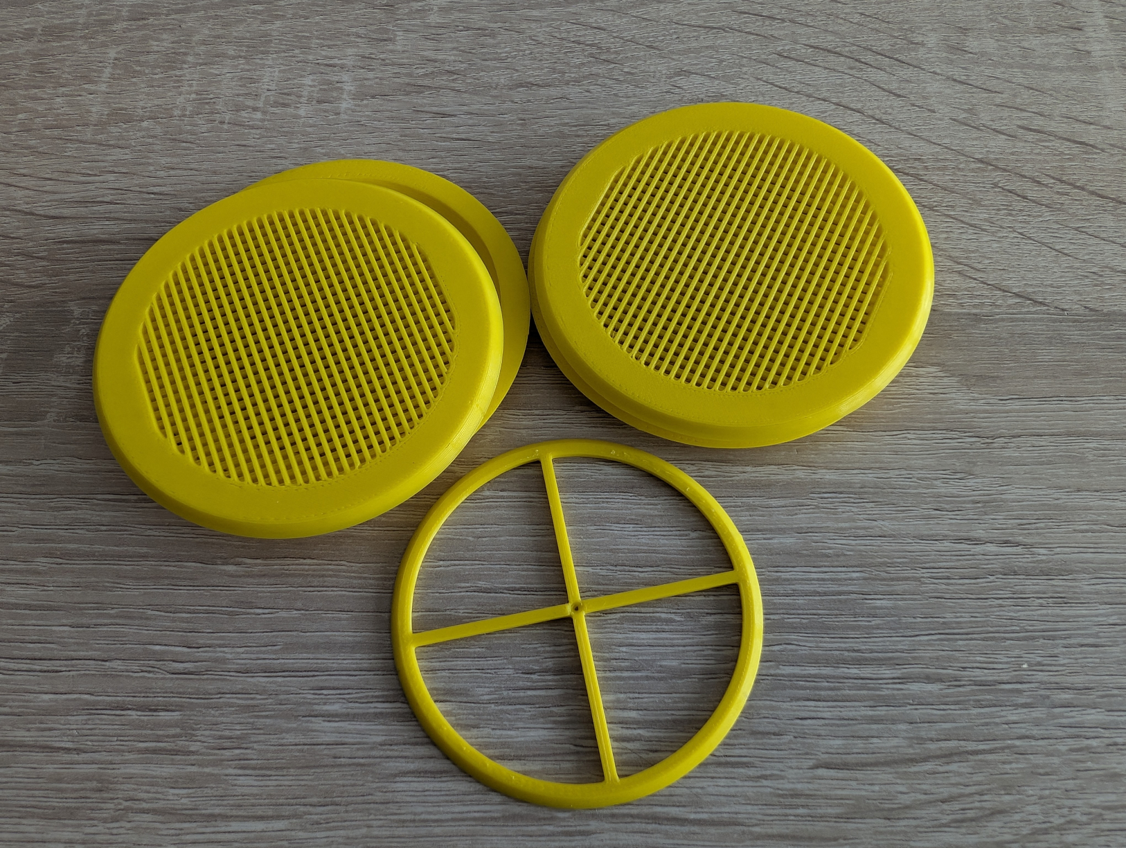 • Die Lüftungsgitter bestehen aus je zwei Teilen und können an den Löchern verschraubt werden. Dabei sind die Deckseiten austauschbar und können beispielsweise gegen vollständig geschlossene Aufsätze oder Metallgitter ausgetauscht werden.