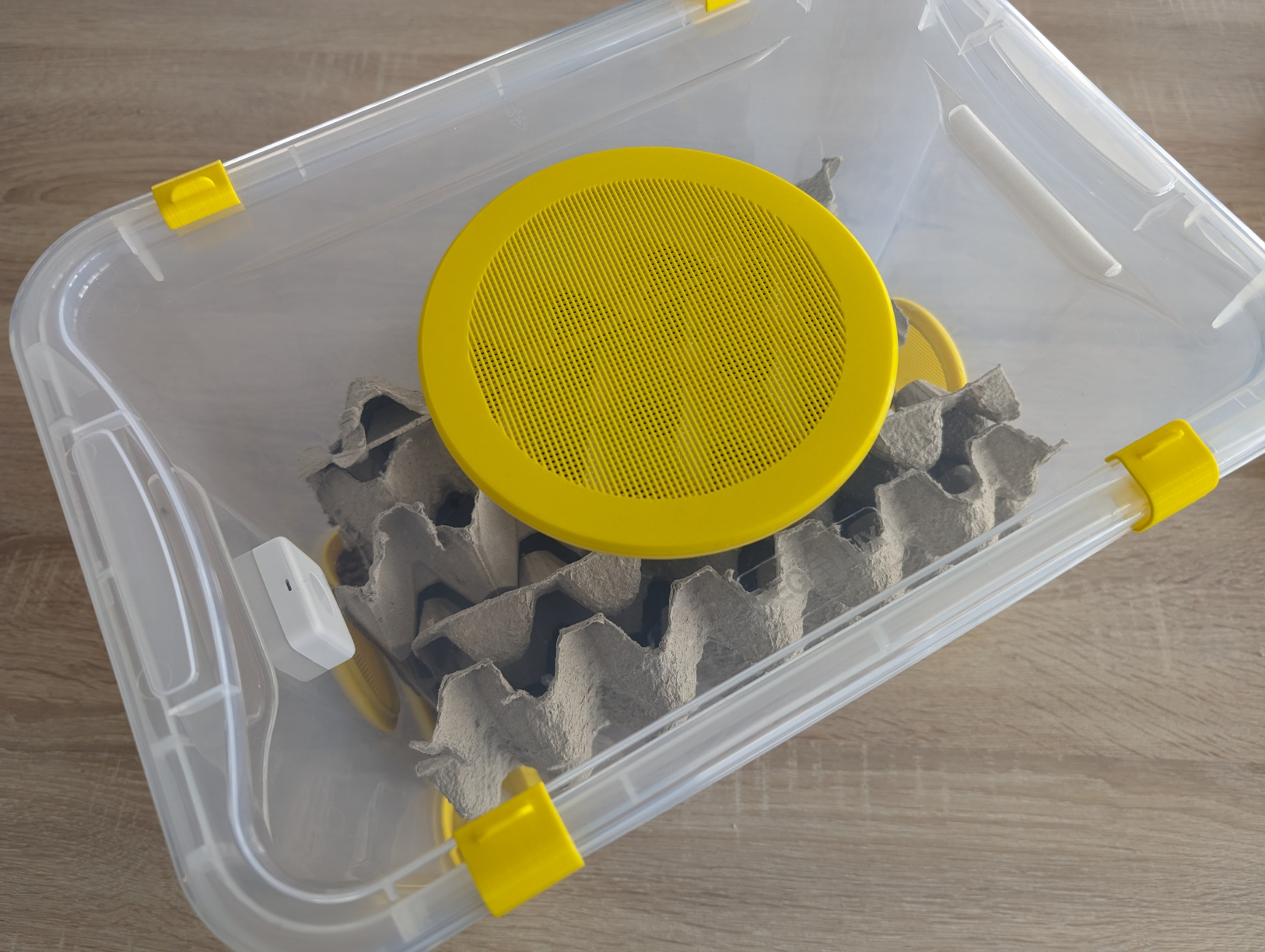 Halbierte Eierpappen (30er – Größe L) leicht versetzt und vertikal in die Box ergeben. Sensor ankleben und Deckel drauf.