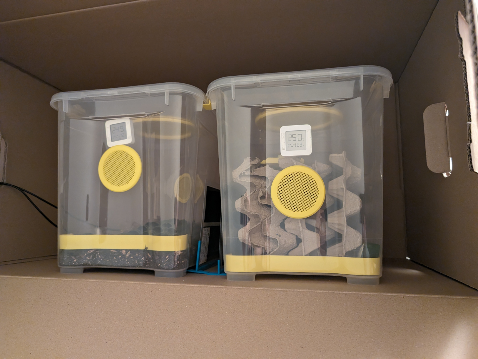 Beheizt werden bei mir zwei Boxen über zwei 7-Watt Heizmatten, welche über den Sensor in Verbindung mit Home Assistant geschaltet werden. Um Wärmeverluste und Konvektion etwas zu vermindern, befinden sich die Boxen in einer großen Umzugskiste. Damit halte ich die Lufttemperatur in den Boxen durchgehend bei 26-27°C und habe noch Reserven für höhere Temperaturen, falls ich die Entwicklung beschleunigen will.