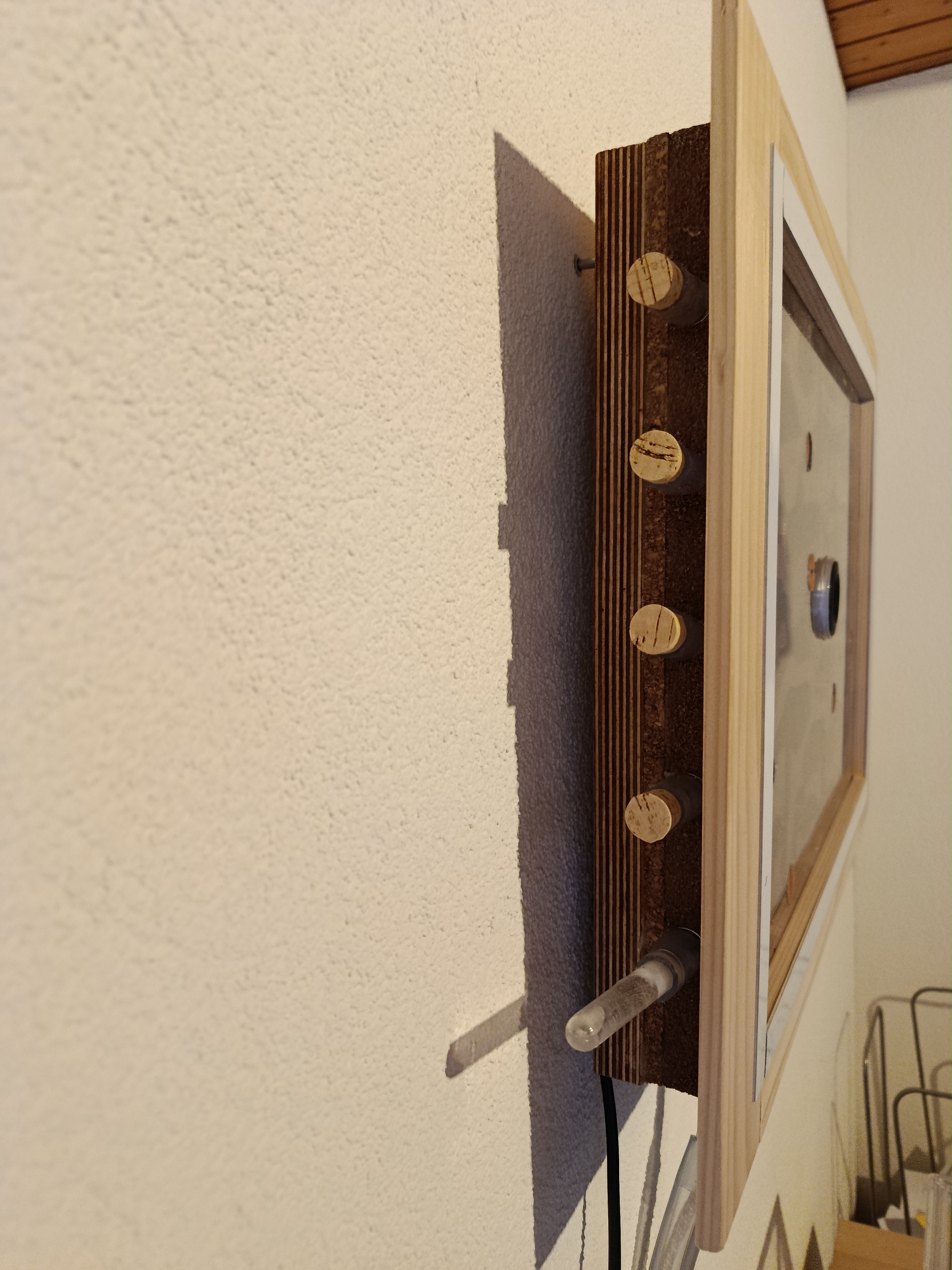 Also die Grundidee ist ein Korknest, welches ich an die Wand hängen werde. Ich werde die Gänge mit drei Schichten Epoxidharz aushärten, damit die Ameisen sich nicht willkürlich durch den Kork arbeiten. Das Nest möchte ich in der Grösse 50x33cm bauen mit Kammern, welche 2-3cm breit, 4-10cm lang und 2cm tief sind. Die Kunstglasplatte wird aufgeschraubt. Dazu führen die Schrauben durch die Korkplatte bis nach hinten in den Holzrahmen. An ausgewählten Gängen gibt es einen von aussen drehbaren Holzstöpsel, welche den Gang öffnet. So kann ich der Kolonie mehr Raum geben, wenn sie wächst.
