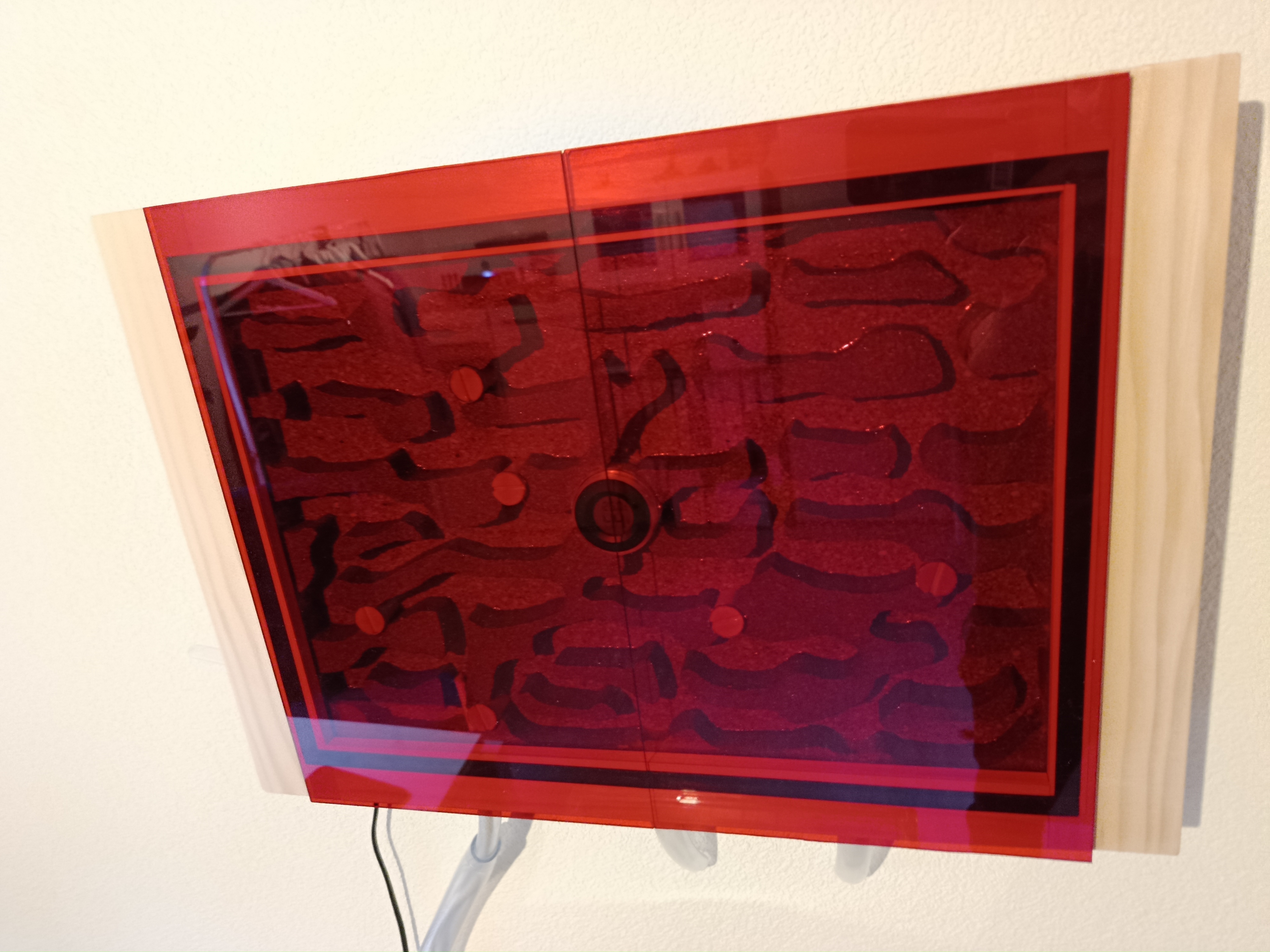 Aber nun zum Nest. Das Nest ist 33x50cm gross. Gebaut aus Kork und mit Epoxidharz ausgehärtet, damit sich die Ameisen nicht rausnagen. Hinter dem Nest befindet sich eine Wärmematte, welche in der Mitte schön warm macht. Gegen aussen gibt es dann einen Temperaturgradienten. Für die Feuchtigkeit gibt es auf beiden Seiten des Nestes je fünf Öffnungen für kleine mit Wasser gefüllte Reagenzgläser. So können sich die Ameisen das Wasser selber holen und ein wenig wird die Luftfeuchtigkeit im Nest wohl auch so steigen (aktuell ist nur ein Reagenzglas angesteckt). Mit den grossen Holzschrauben kann ich den Ameisen das Netz Stück für Stück öffnen. Aktuell sind nur drei Kammern zugänglich. Aber auch diese werden sie wohl erst beziehen, wenn die Kolonie bereits ordentlich gross ist (Vielleicht 100 Ameisen?). Bis dahin halte ich sie in Reagenzgläsern. Oben am Nest gibt es Lüftungslöcher. Diese habe ich jetzt mit einer Plexiglasplatte verschlossen, in welche ich ganz viele 1mm grosse Löcher gebohrt habe. Schliesslich wird das Nest mit zwei roten Plexiglasplatten "abgedunkelt*, welche über ein Magnetband halten. Eigentlich hatte ich noch geplant hinten an der Blende noch einen LED-Streifen rund ums Nest anzubringen, für schön und so. Aber das Licht hat dermassen durch die ganzen Öffnungen rundherum (Reagenzgläser, Lüftungen, Eingänge) ins Nest geleuchtet, dass ich darauf verzichtet habe.