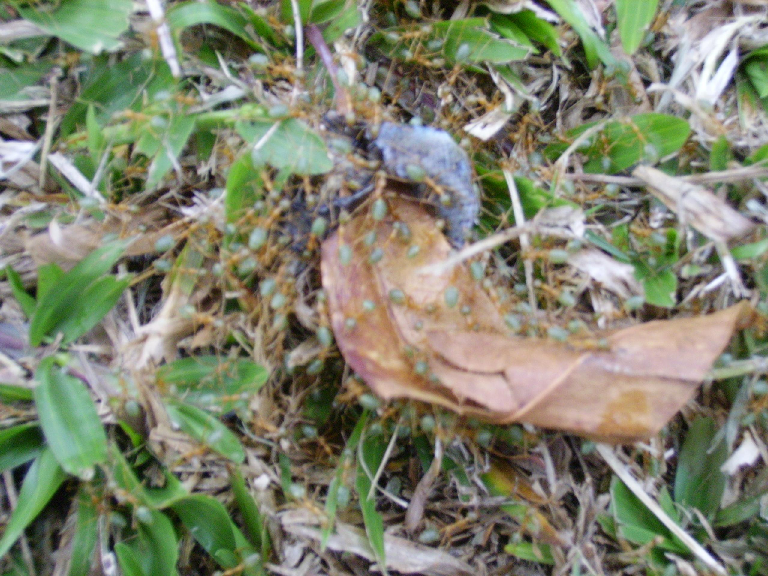 Hallo liebe Oecophylla smaragdina Halter und interessierte. Ich mache gerade einen Auslandsaufenthalt in der NĂ€he von Cairns, Queensland, Australien. Hier sind Oecophylla smaragdina eine Plage. WEnn jamnd diese Ameisen im garten hat versucht er meistens ise wieder loszuwerden, da Die blĂ€tter, die zu Nestbau benutzt wurden irgendwann verwelken. Wenn die Kolonie zu groß ist und der Baum zu klein und schwach, kann das schonmal der Grund fĂŒr das sterben eines Baumes sein. Jedenfalls habe ich in der nĂ€he von meiner Gastfamilie ein GrundstĂŒck gefunden, auf dem Oecophylla smaragdina wohnen (sry fĂŒr den komischen ausdruck aber welches Wort soll ich denn sonst nehmen, nisten?) ES ist eine Ă€ltere Kolonie wĂŒrde ich sagen, so groß wie sie ist. Ich habe mal alle Nester fotografiert (sry fĂŒr die miese Quali, aber die Kamera ist bereits 5 Jahre alt). Ich hoffe man kann erkennen wie groß die einzelnen Nester sind. Ich bin mir ĂŒbrigens ziemlich sicehr, das das eine Kolonie ist.
