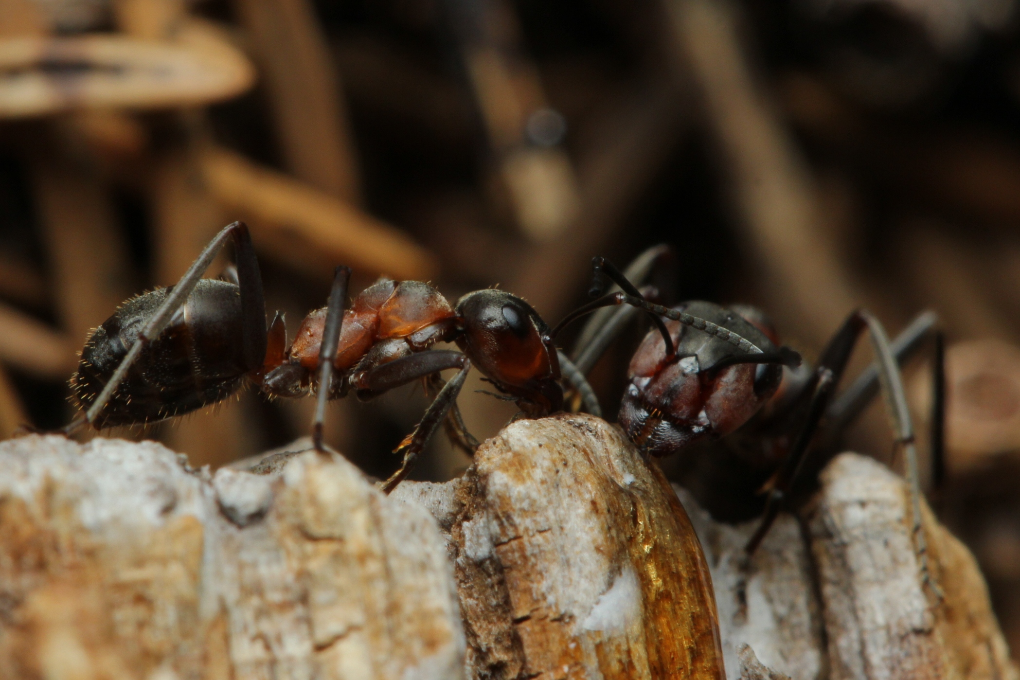 2. Hier müsste es sich um Formica polyctena handeln, am Rücken (Pronotum, Mesonotum, Propodeum) ist so gut wie keine Beborstung/Behaarung erkennbar. Für das Foto wurden die Beine der Armen kurzfristig zw. den Fingern eingeklemmt.