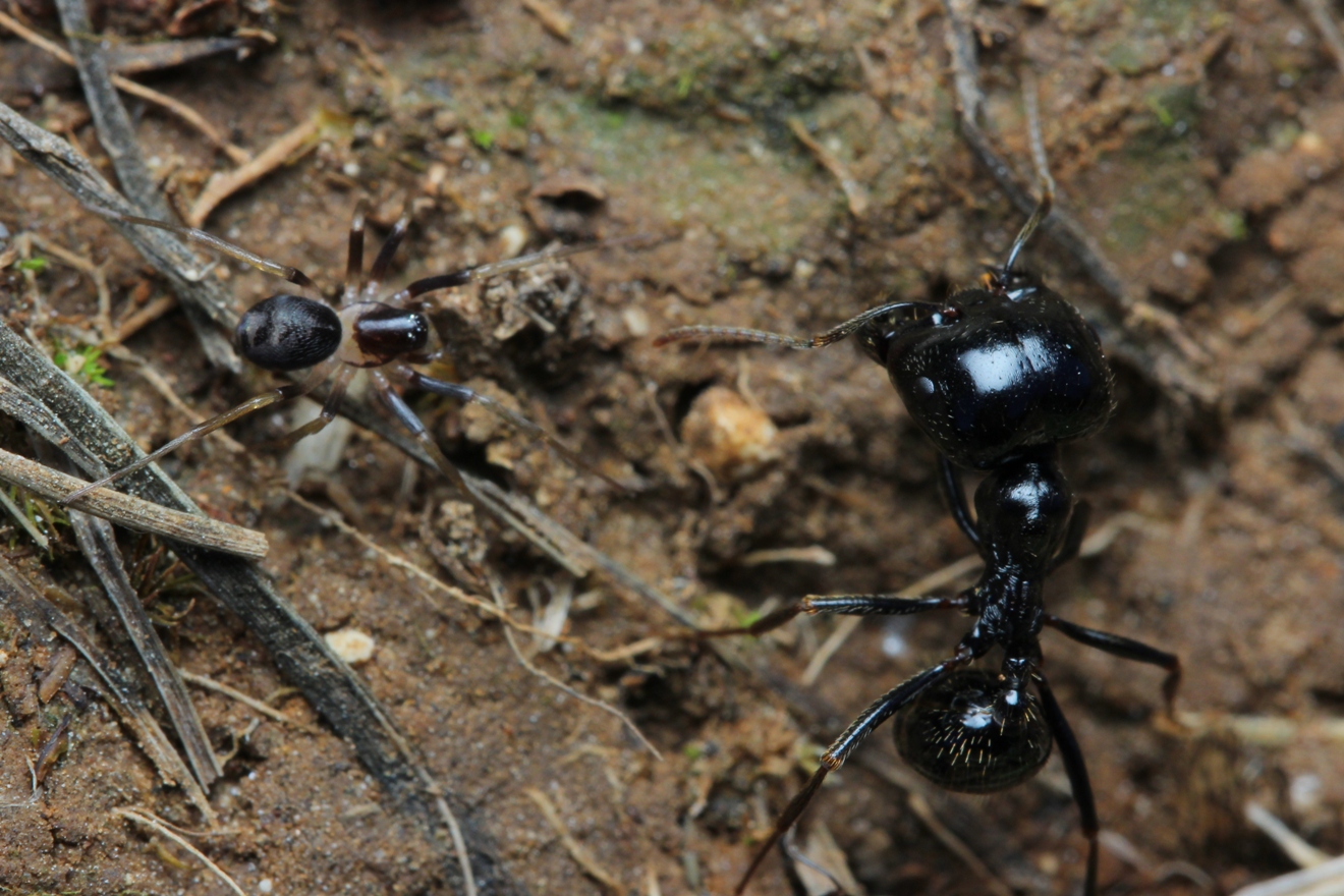 2. Die Spinne kommt "ungeniert" nĂ€her. Keine einzige Nestgenossin der Ameise scheint sich darum zu kĂŒmmern. Kein Vergleich zu der viel schnelleren Camponotus vagus, dort wird zumindest "Alarm" ausgelöst."