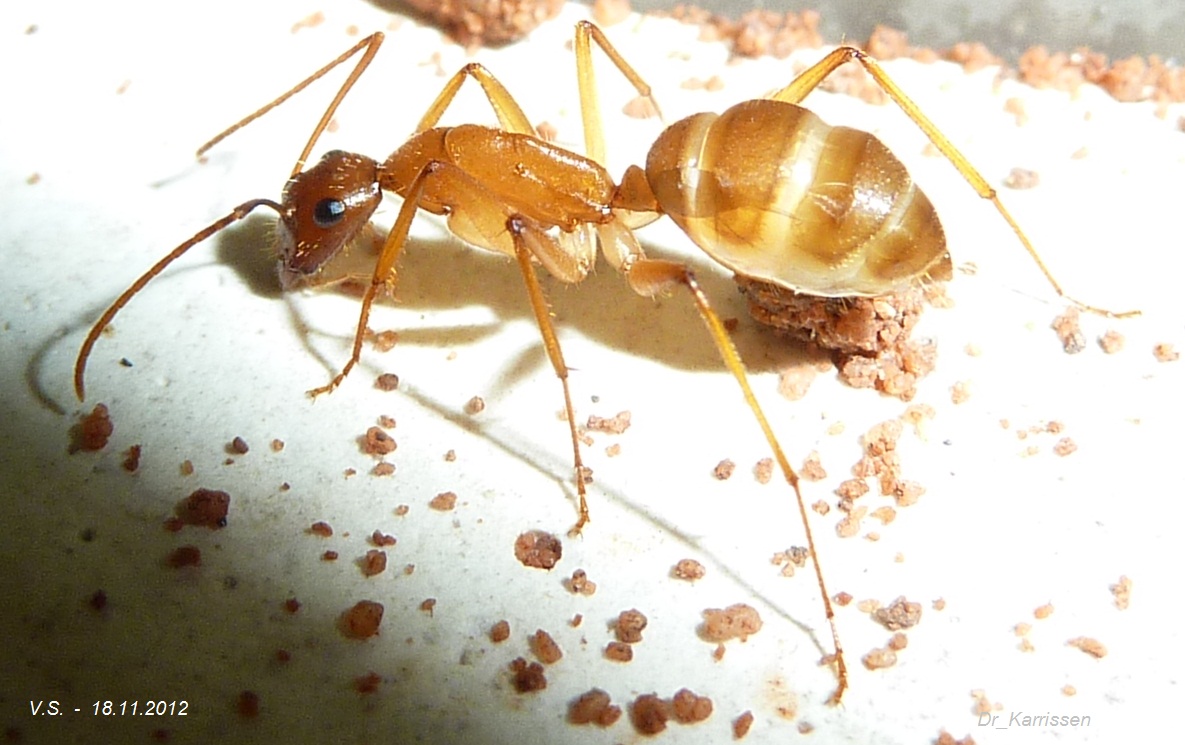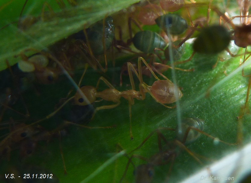 Was auch immer es ist - es ist auch in der Gaster einer jungen Oecophylla smaragdina Arbeiterin gut zu erkennen, wenn das Licht aus dem richtigen Winkel kommt.