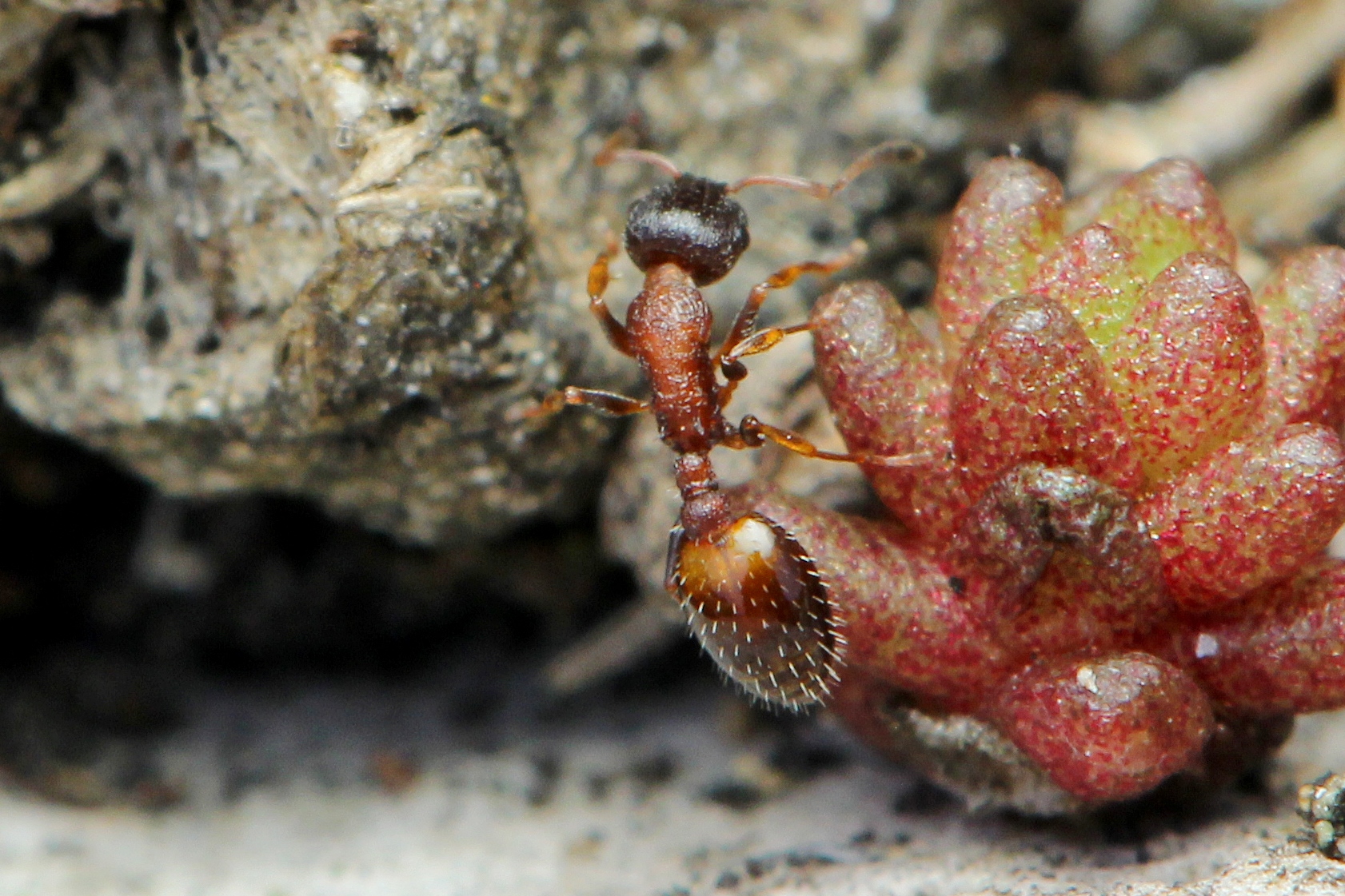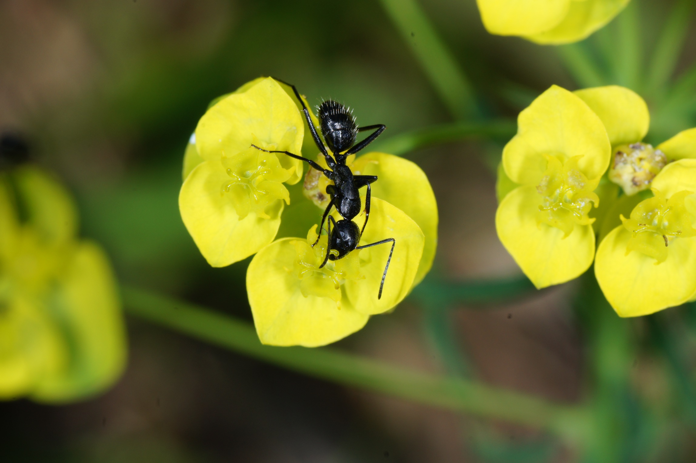 3. Camponotus vagus ist hier häufig zu finden, die Nester durchwegs in Holzstrünken. Hier sehen wir eine Arbeiterin beim Blütenbesuch auf einem Wolfsmilchgewächs: