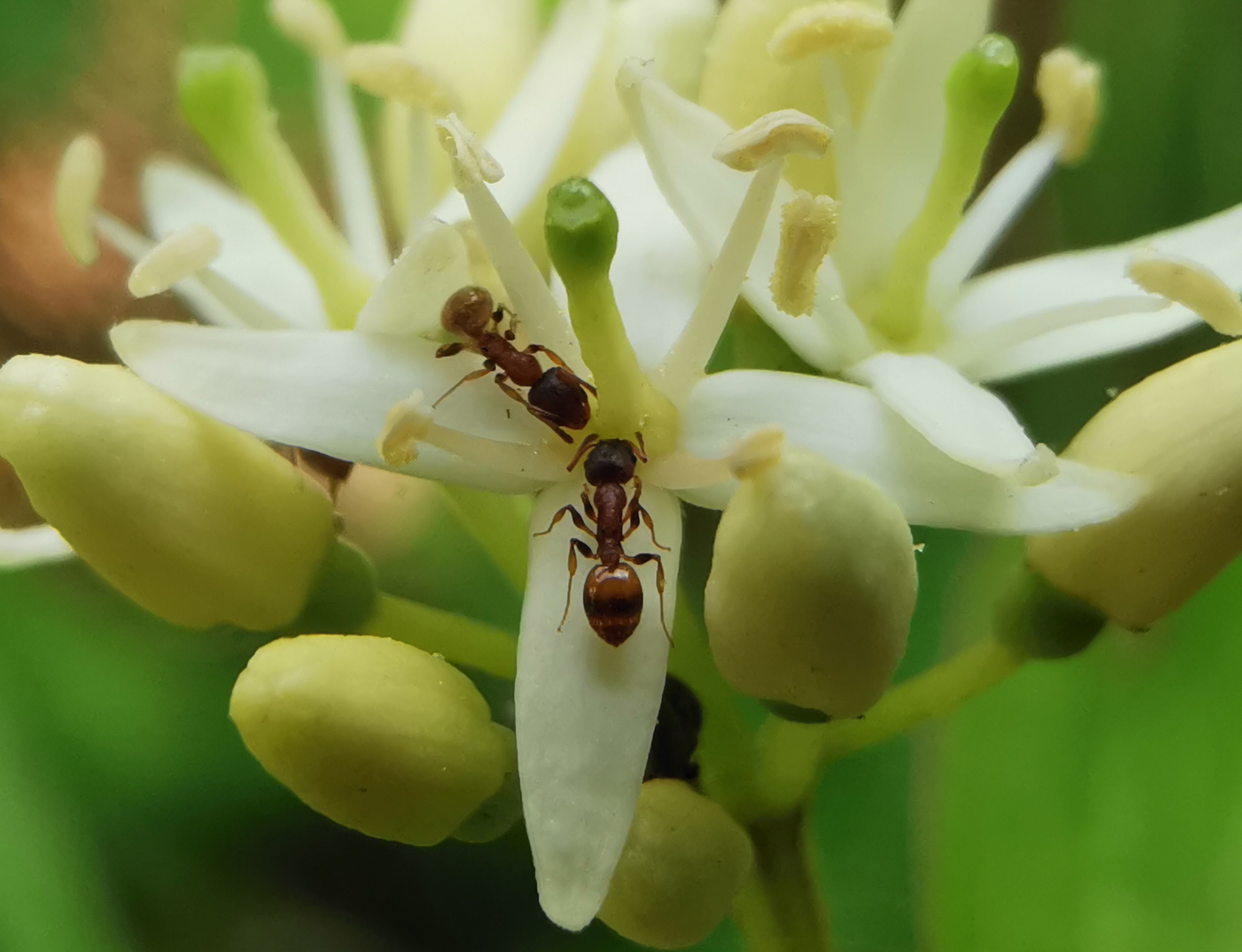 Temnothorax affinis an den BlĂĽten des Roten Hartriegels - Cornus sanguinea.