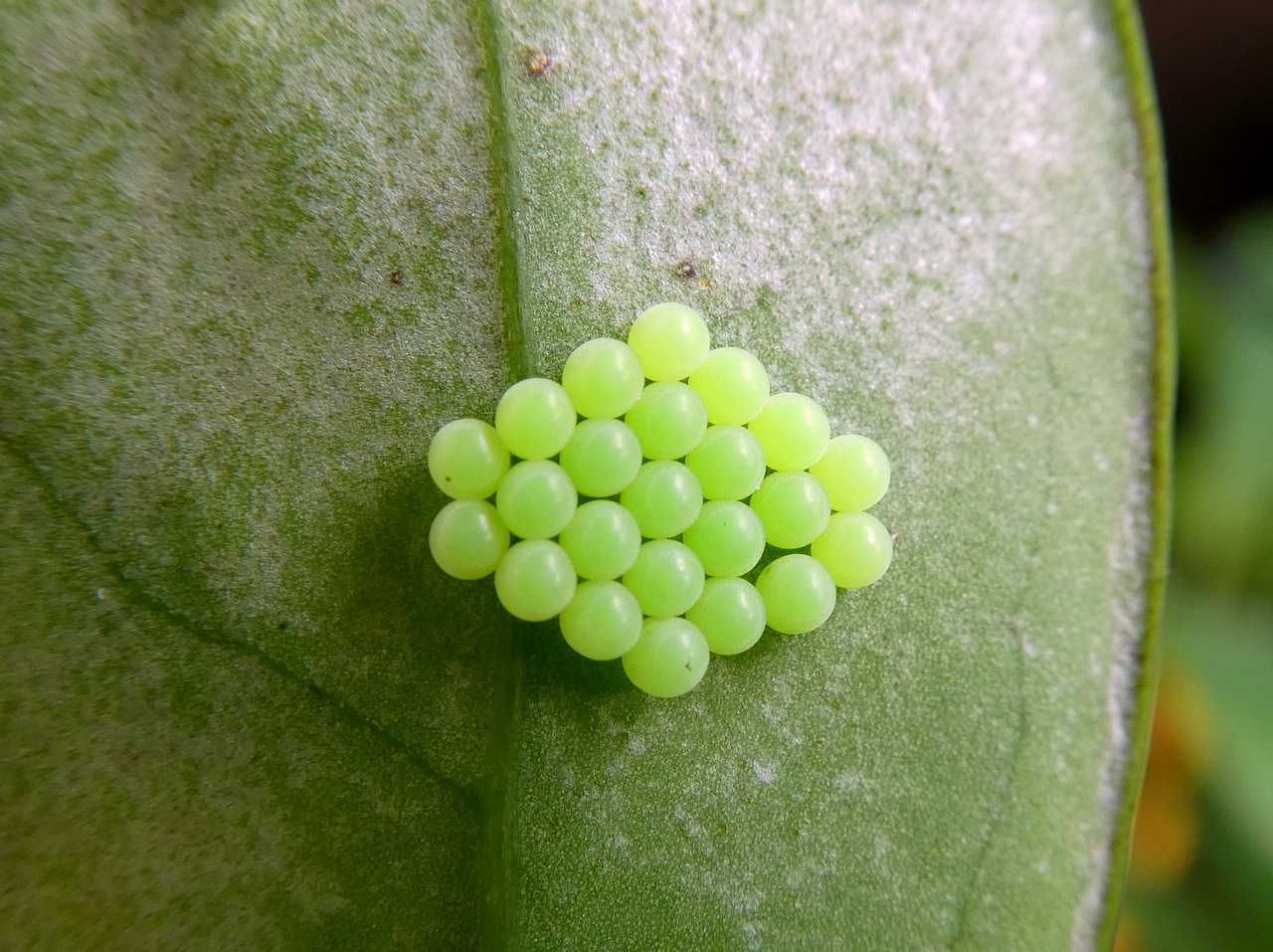 Wanzeneier auf der Blattunterseite bei meiner Schefflera.