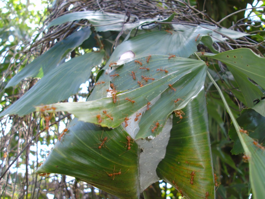 hier mal ein Bild von Oecophylla smaragdina, wie sich an einer kleinen (mir) unbekannten Schlange verköstigen und das dazugehörige Nest der Kolonie.