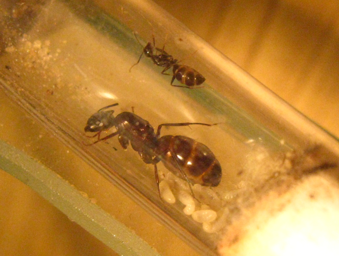 Fehlanzeige! Diese übrig gebliebene Arbeiterin schlüpfte zwar, hatte es mit dem Ausflug nach draußen aber äußerst eilig und noch am Schlupftag versuchte sie mehrfach, die Paraffinölabsperrung der Heimchendose zu überlaufen. Drei mal setzte ich sie vorsichtig in die Öffnung des RGs, damit sie ins Nest kehrt.