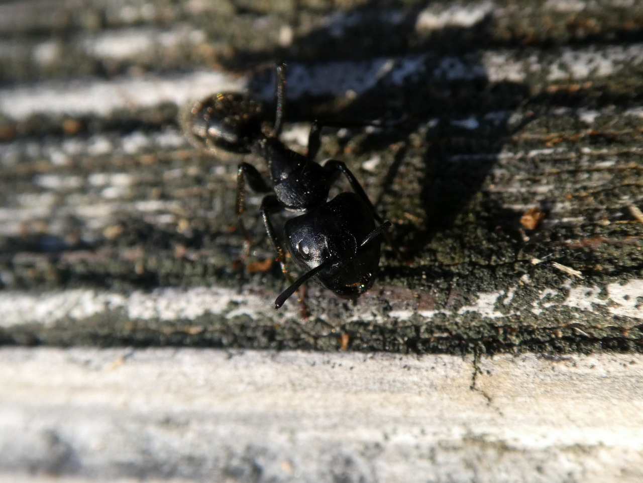 Das Leben als Nestwache ist kein einfaches... Dieser Major -Arbeiterin von Camponotus vagus fehlen ein Bein, beide Fühlergeißel und ihr linker Scapus ist auch zur Hälfte fort. Aber sie macht weiterhin ihren Job, wenn auch etwas orientierungslos.