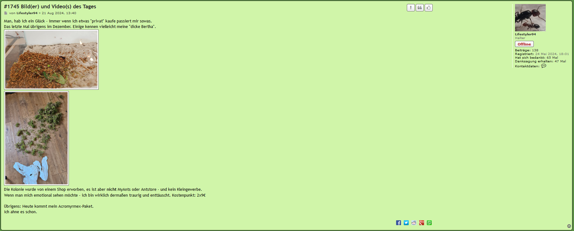 Die Kolonie wurde von einem Shop erworben, es ist aber nicht MyAnts oder Antstore - und kein Kleingewerbe.