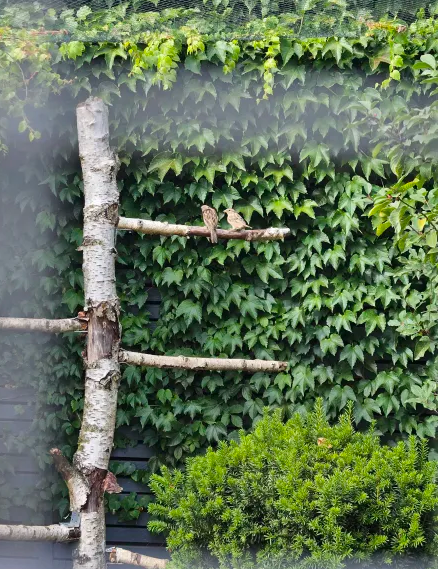 A.octospinosus. Hausspatzen in der Voliere der Hühner, die Futter klauen möchten.