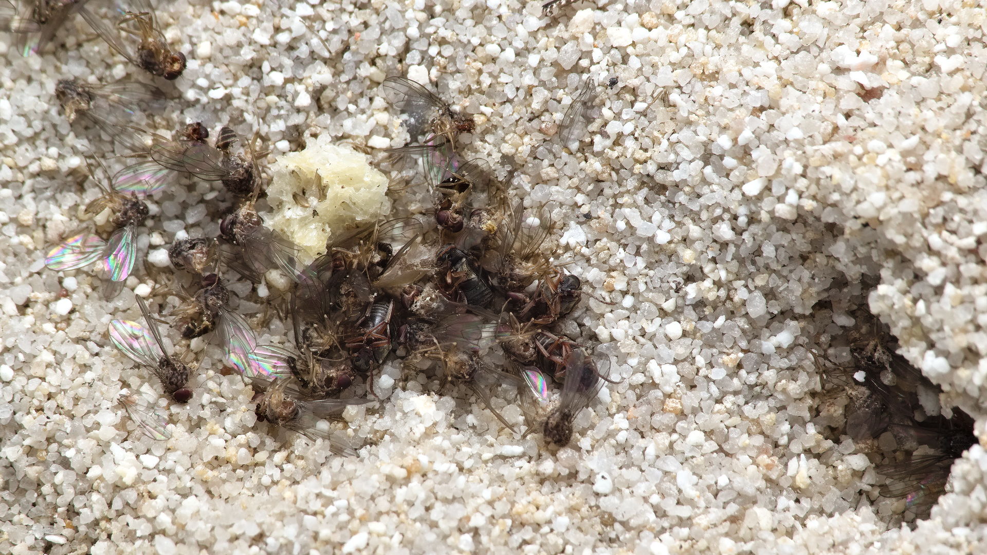 Heute schaue ich rein und sehe jede Menge Fruchtfliegen aber so gut wie keine Arbeiterinnen mehr dran? Waren sie satt, habe ich zu viel gefüttert? Nein, denn wenn man näher hinschaut sieht man, dass sie bei allen Fliegen entweder den Hinterleib komplett abgetrennt haben oder große Teile von diesem fehlen. Sie haben also nur den proteinreichsten Teil der Fliege entfernt und das, was man sieht ist der "Abfall".