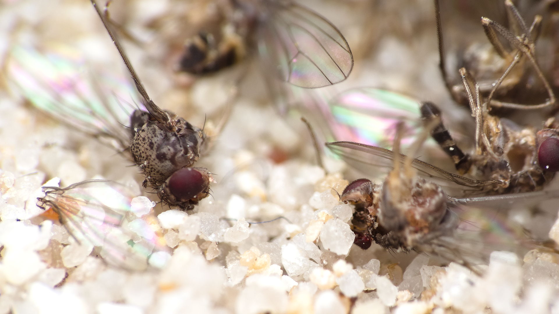 Gestern habe ich den Ameisen jede Menge Fruchtfliegen gegeben und es waren mehrere hundert Arbeiterinnen damit beschäftigt die Fliegen zu bearbeiten.