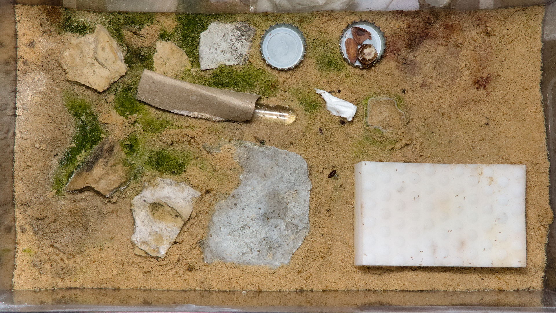 Schönheit liegt bekanntlich im Auge des Betrachters, aber den Solenopsis fugax scheint es in dem Erdnest sehr gut zu gehen. Auch hat sich eine natürliche Bepflanzung in Form von Algen gebildet. Der Schwamm dient übrigens als Bewässerungshilfe. Der saugt viel Wasser auf und gibt es langsam an das Substrat ab.