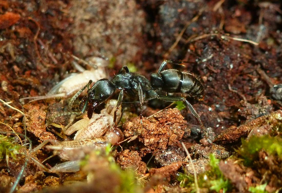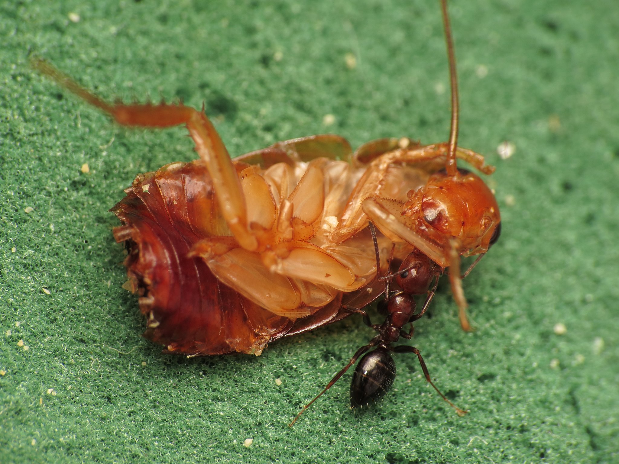 Obwohl sie die Schaben in dieser Größe sicher leicht ins Nest zerren könnten, werden diese vor Ort zerlegt. Sogar noch kleinere Nymphen werden nicht ins Nest transportiert.