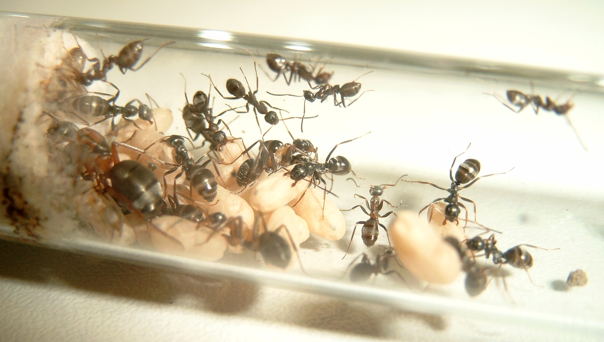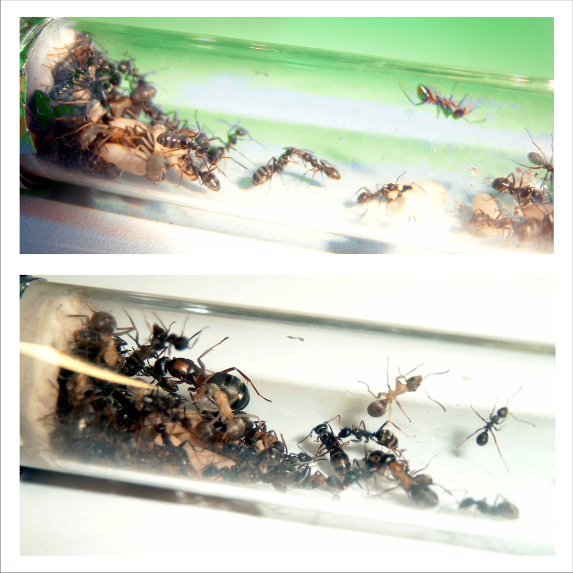 Ich habe erst kürzlich Deine Publikation hierzu gelesen und aus diesem Grund auch dieses Photo gepostet. Bei der F. rufibarbis handelt es sich um eine Gründerkolonie im Reagenzglas (Gyne vom 24.06.2012) mit der üblichen Brut (8 Pygmäen). Puppen (25) von F. fusca wurden erst Ende August zugegeben, nachdem die F. rufibarbis Brut längst geschlüpft war. Die ersten geschlüpften F. fusca wurden wie erwartet vernachlässigt und angefressen. Ich hab den Ablauf natürlich nicht rund um die Uhr verfolgt. Irgendwann haben es die ersten F. fusca geschafft und dem Rest zum Schlüpfen verholfen. Inwieweit F. rufibarbis sich da beteiligt hat kann ich auch nicht sagen. Momentan ist F. fusca in der Überzahl, beide Arten vertragen sich jedoch.