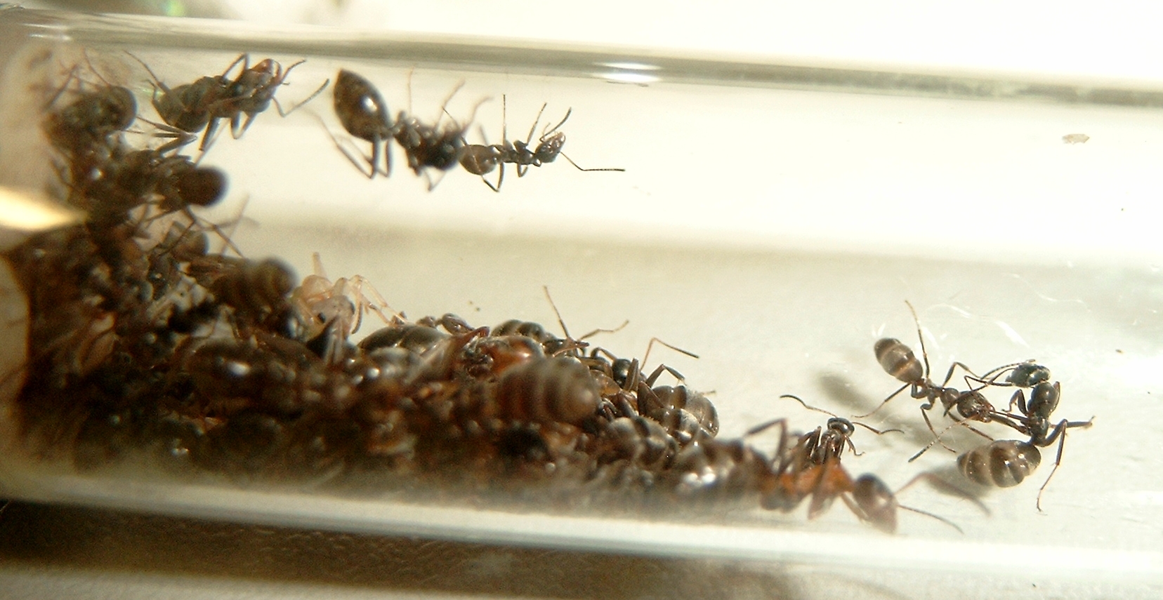 Im oberen Bild, leider nur schwer zu erkennen, Trophallaxis zw. F. fusca (links) und F. rufibarbis Pygmäe (rechts).