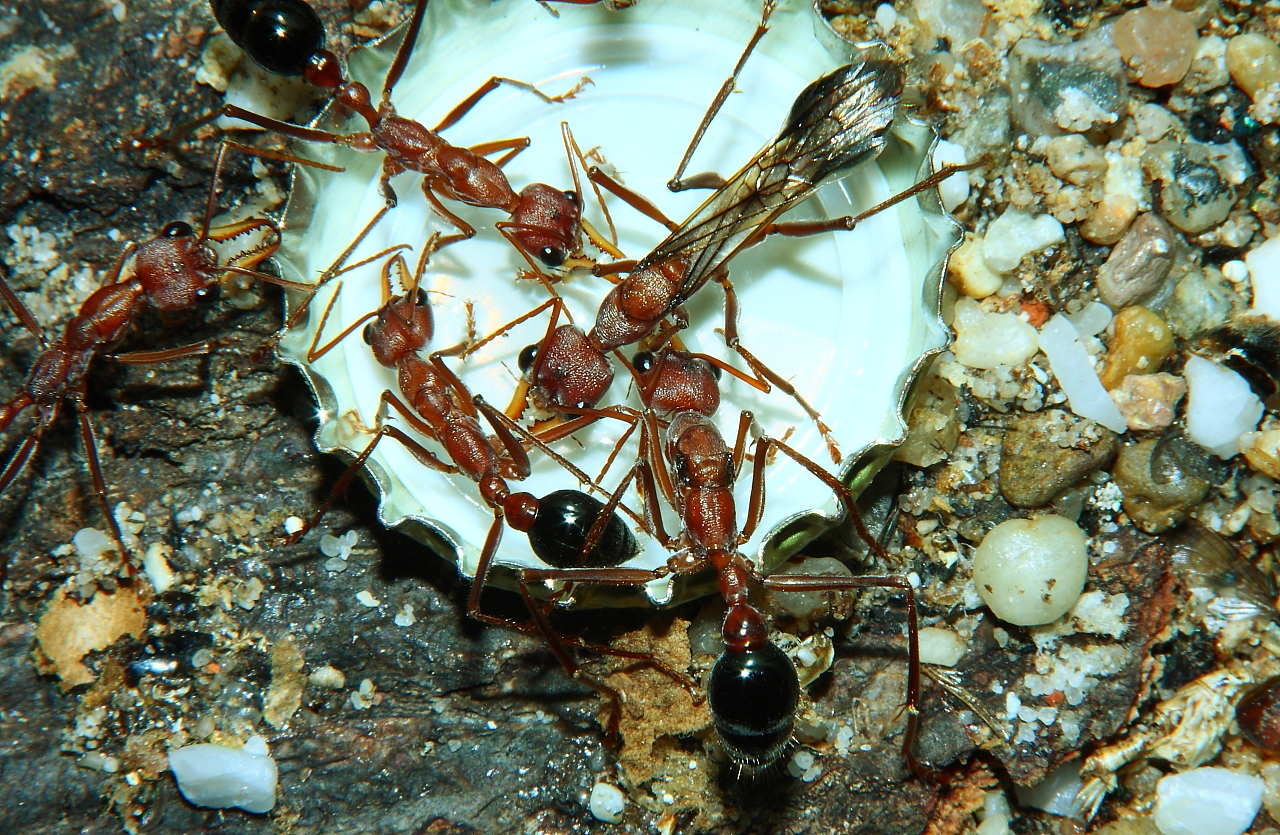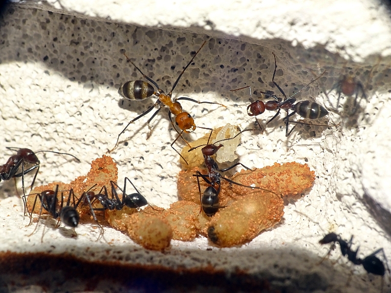 Myrmecia, durstige Jungköniginnen zwischen Arbeiterinnen