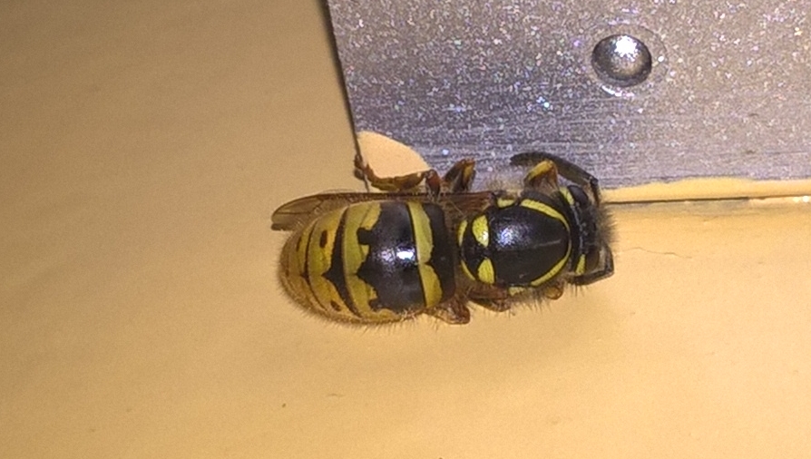Ein verirrter Hausgast hängt seit gestern auf der Innenseite unserer Haustür. Die Temperaturen sind hier noch deutlich kühler als draußen. Vielleicht gelingt es mir sie hinauszubringen, sie bewegt sich quasi garnicht. Schätze mal es ist eine Wespe?