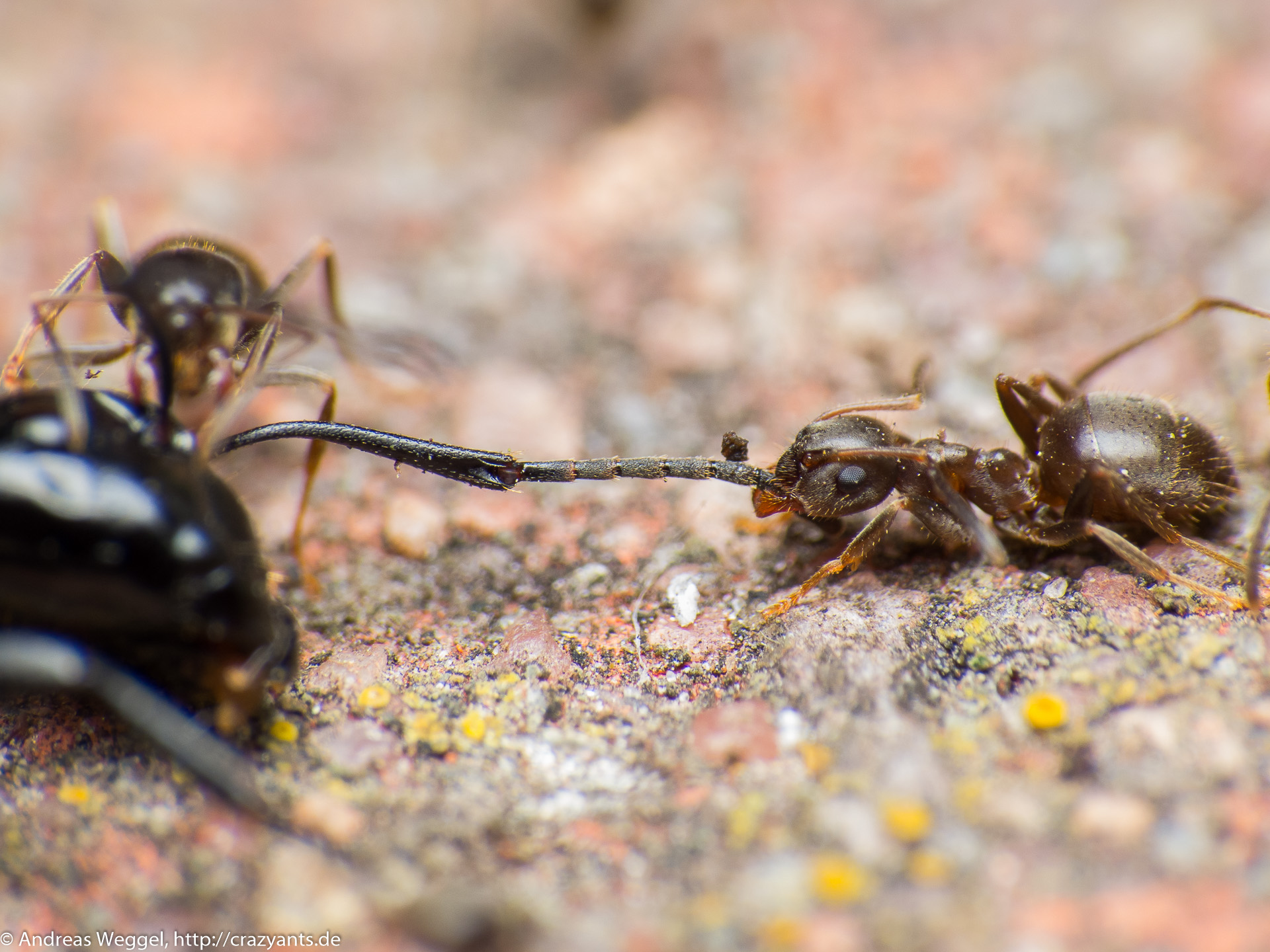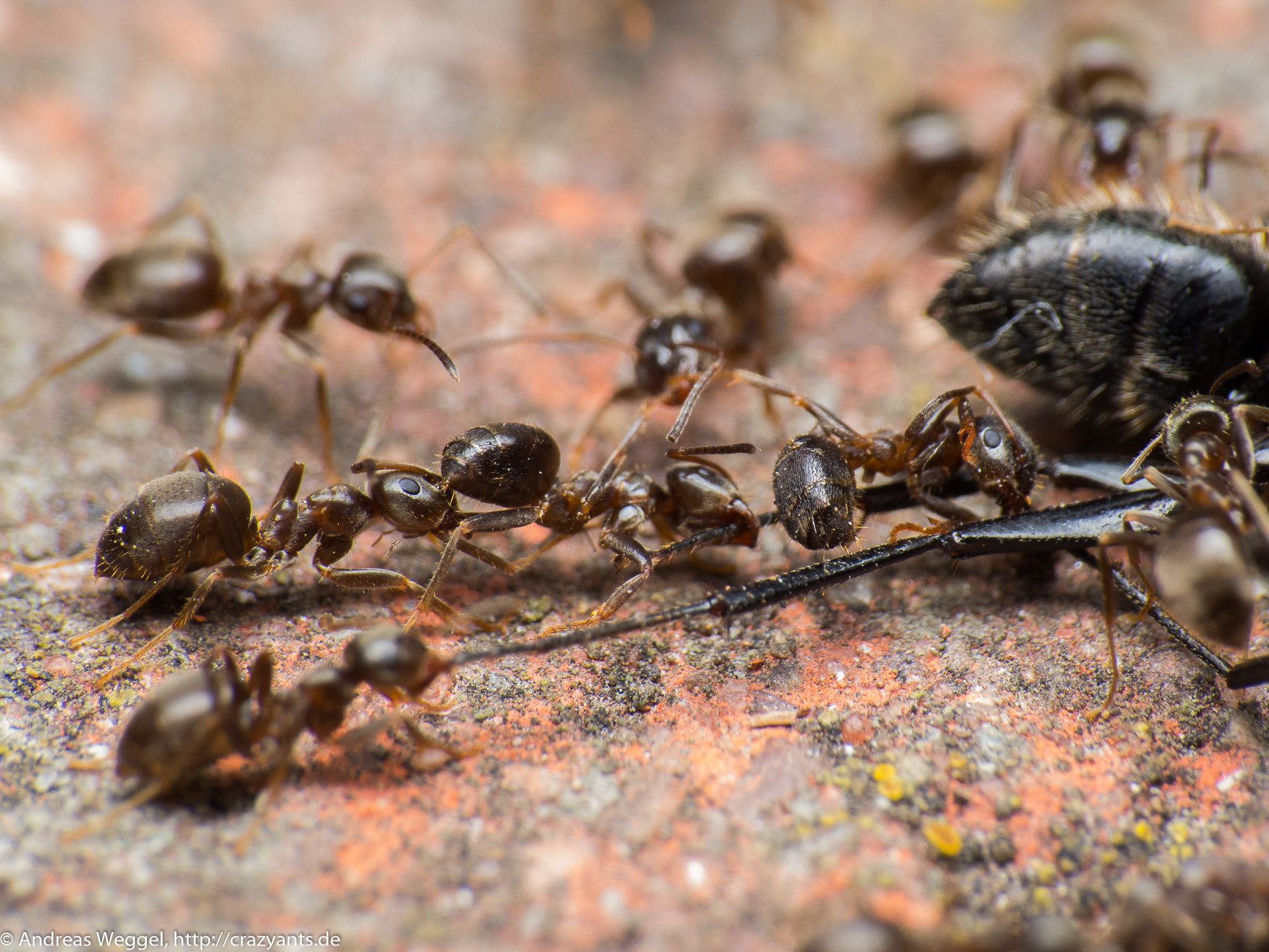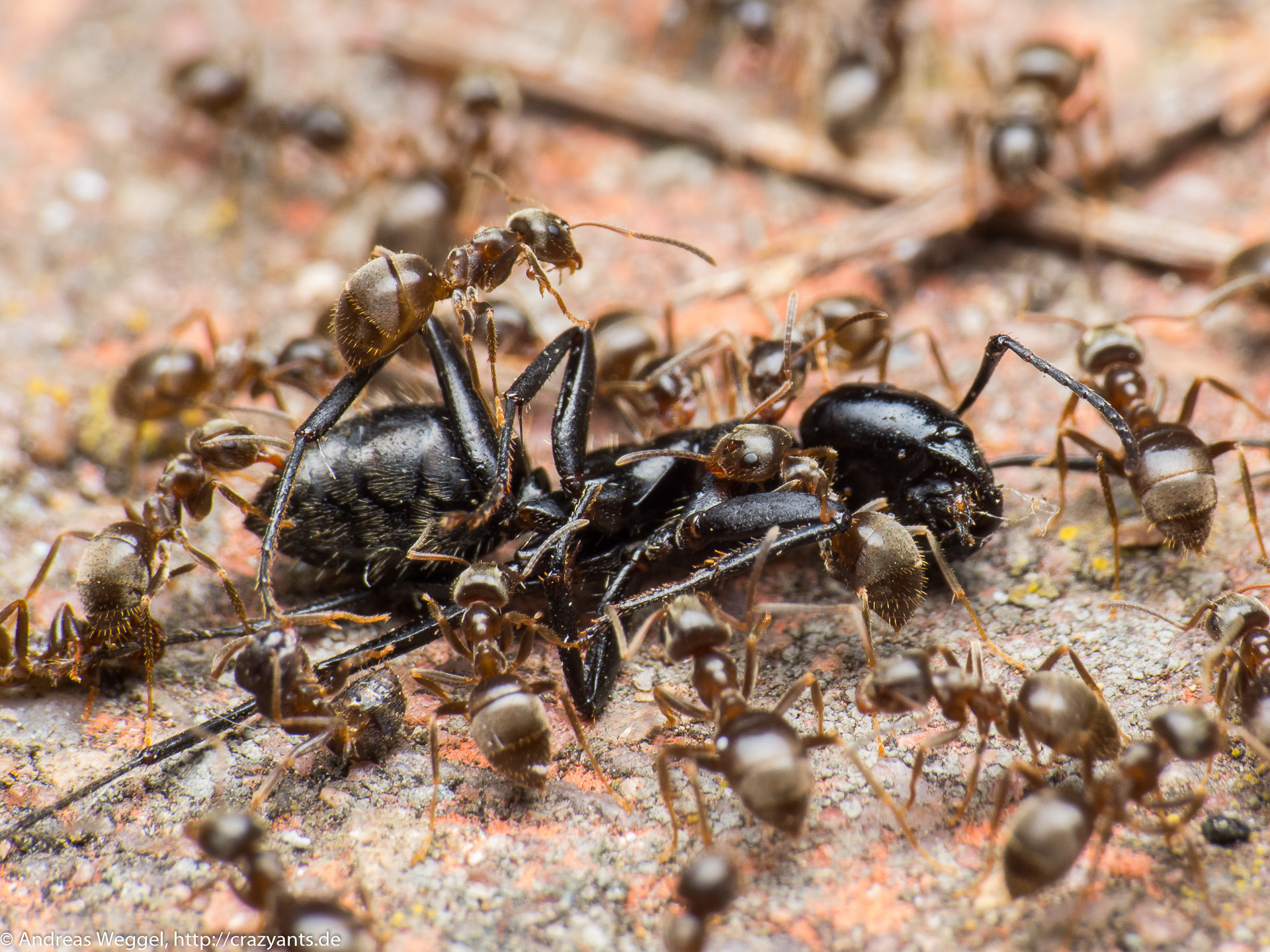 Klein gegen groß. Die Lasius niger Arbeiterinnen haben es geschafft eine um ein vielfaches größere Camponotus vagus Arbeitern zu überwältigen.