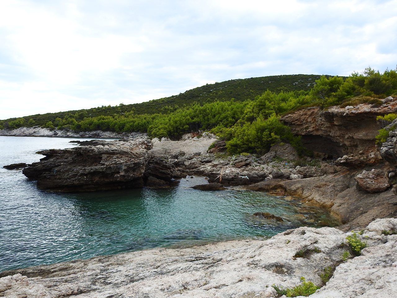 Hier ist der Eingang zum Nest zu sehen, eine Soldatin war gerade dabei Etwas hinein zu ziehen. Die Küste ist an dieser Stelle, wie an so vielen in Kroatien, von Karstgestein geprägt. Das Nest war in einem kleinen Streifen aus Erdmaterial im Felsen. In der Regel bleibt es an dieser Stelle (abgesehen vom Regen) wohl trocken, aber ich konnte mir gut vorstellen, dass bei stärkerer See der Felsen und damit auch das Nest, regelmäßig vom Meerwasser überflutet wird.