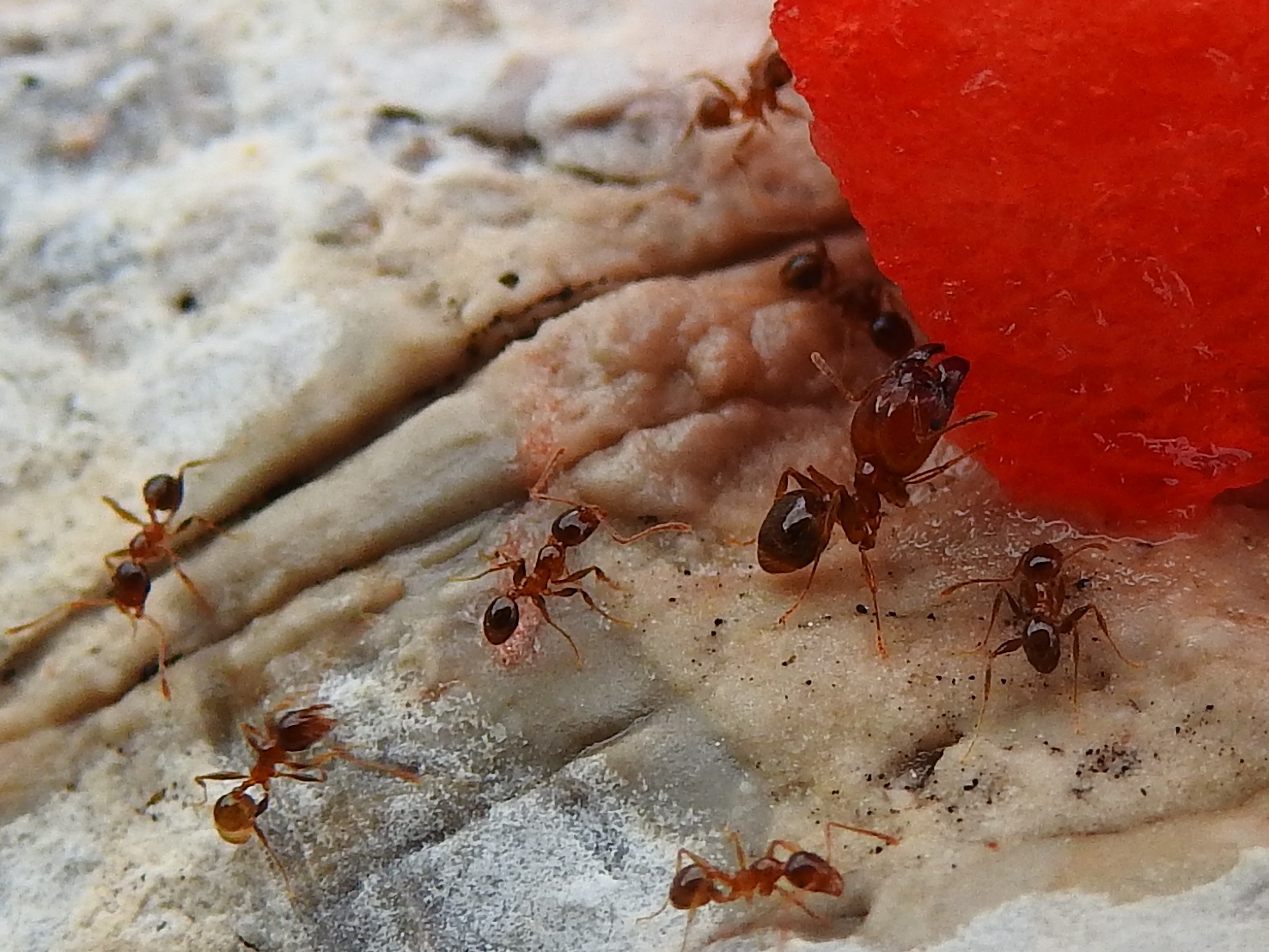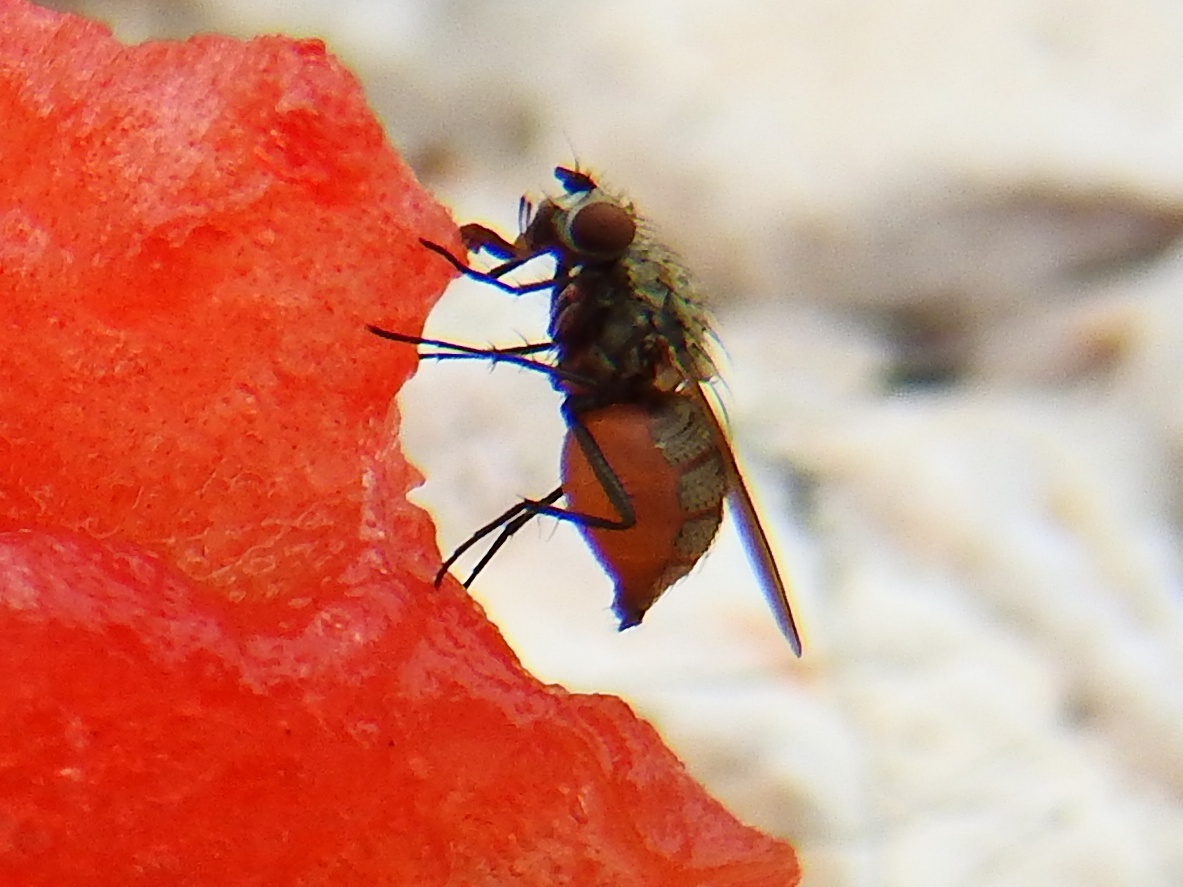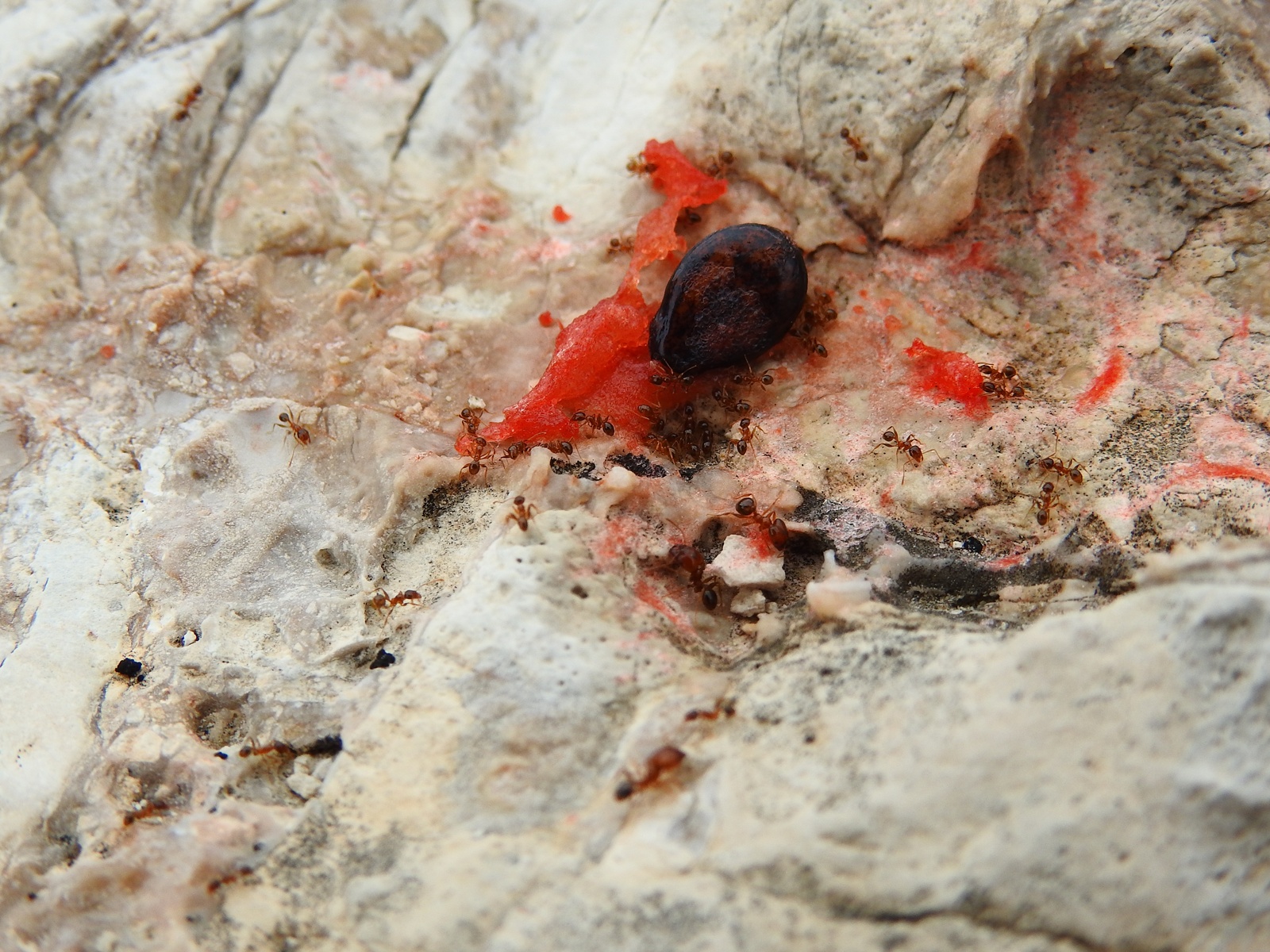An der Küste der Halbinsel Pelješac hatten wir September letzten Jahres Wassermelone im Gepäck. Ich bemerkte, dass die ausgespuckten Kerne eine Kolonie Pheidole pallidula angelockt hatten. Die Reste hätten vermutlich gereicht, aber ein kleines Stück wollte ich ihnen noch gönnen und siehe da, eine Fruchtfliege wollte auch etwas abhaben.