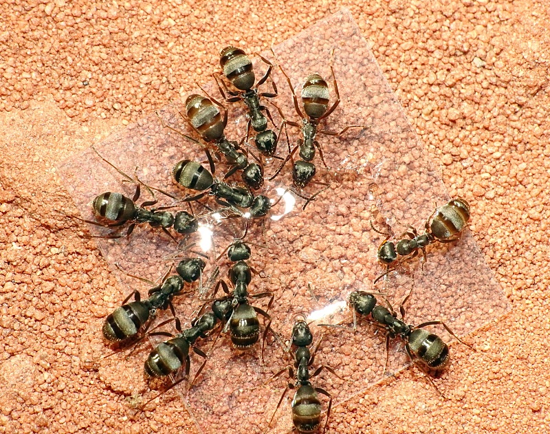 Die Camponotus vagus Kolonie im Garten gibt es auch in diesem Jahr noch und es geht ihr prächtig. Ich konnte bereits Geschlechtstiere an den Nestausgängen sehen, somit dürfte es wohl bald zum Schwarmflug kommen. Hunger haben sie auch wie eh und je und wenn man sie direkt auf ihrem Nest füttert, reagieren sie besonders aggressiv: