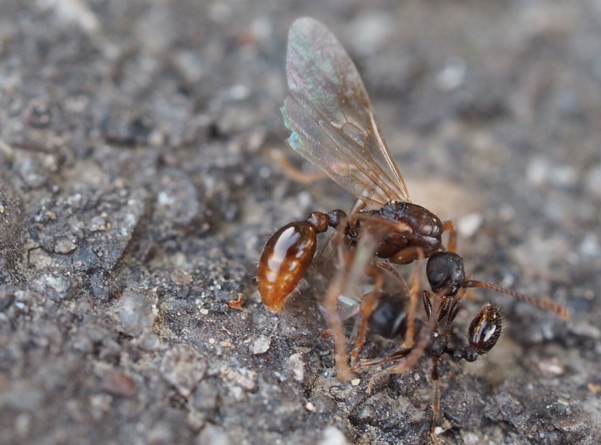 Hier wird ein Myrmica cf. ruginodis -Geschlechtstier von einer Tetramorium