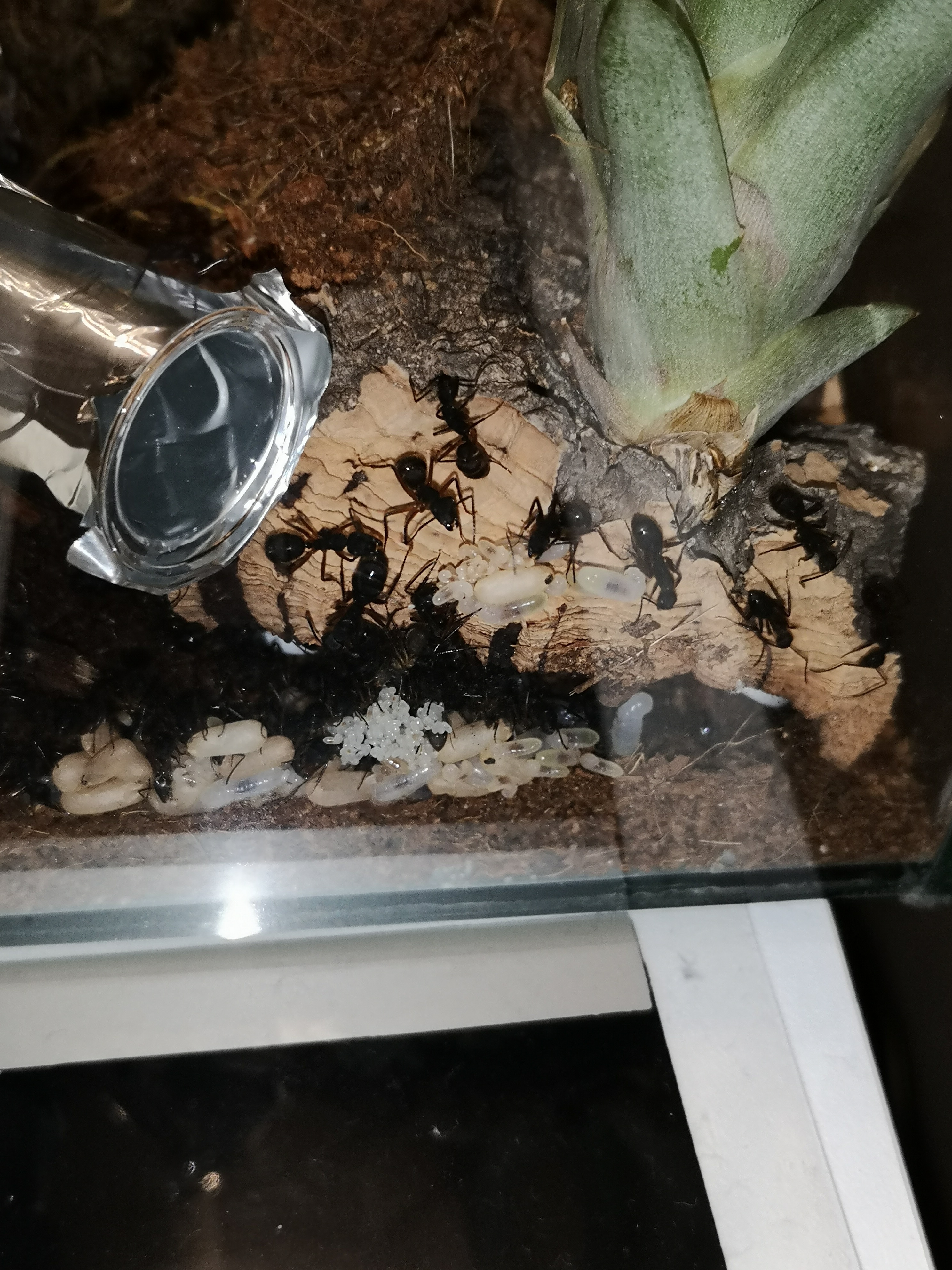 Camponotus brasiliensis. Die Kolonie umfasst wohl keine 40 Arbeiterinnen und auf dem Bild sieht man noch nicht mal die gesamteBrut .