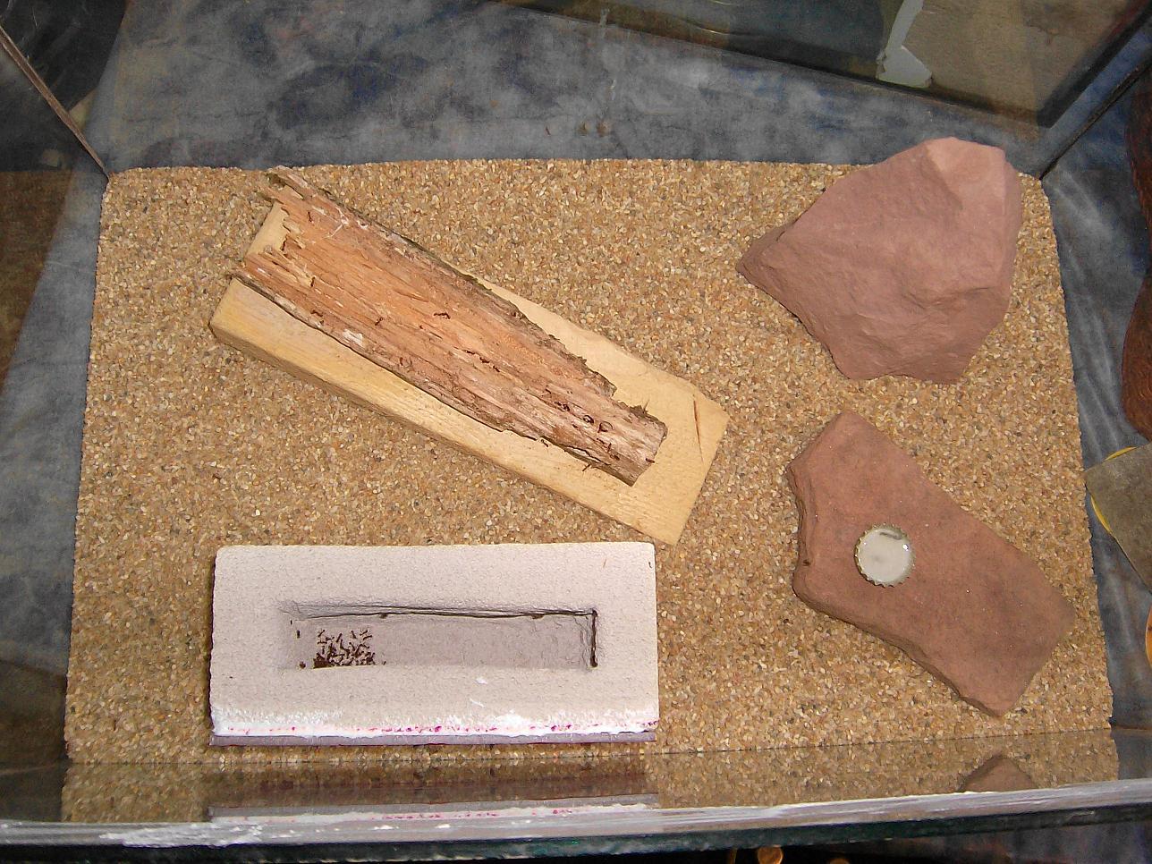 Mein formicarium (falls mann es das nennen darf) von oben. Mann sieht den Ytong und davor ein stück holz. Das ist das stück holz das Ich geholt habe mit Ameisen drinn. Wie mann sieht sind ein teil der Kolonie in den Ytong umgezogen nur sind sie direkt in die wasserkammer eingezogen und jetzt kann Ich nicht mehr wässern um ihnen es schön feucht zu halten. Ist das schlimm? Gehen die auch wieder raus? Was kann Ich da tun?