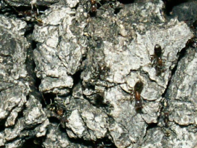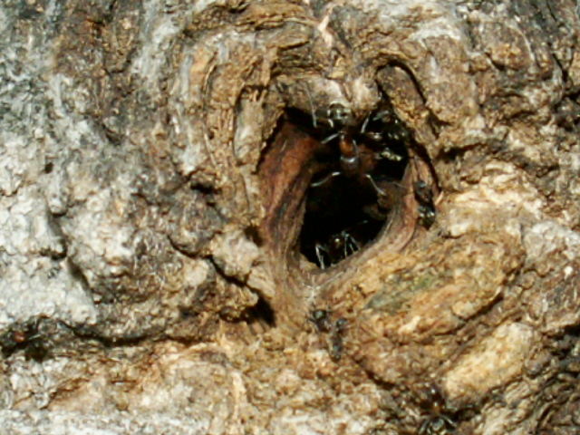 In vielen Eichen lebt eine Dolichoderine, Liometopum spec.. Die Kolonien sind sehr volksstark, eine Kolonie kann mehrere Eichen besetzen. Ich fand Kolonien von Liometopum microphalum vor Jahren auch an der Donau in Ungarn, deren Kolonien waren hier noch sehr viel grösser.