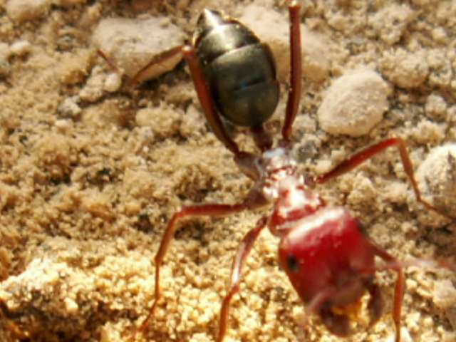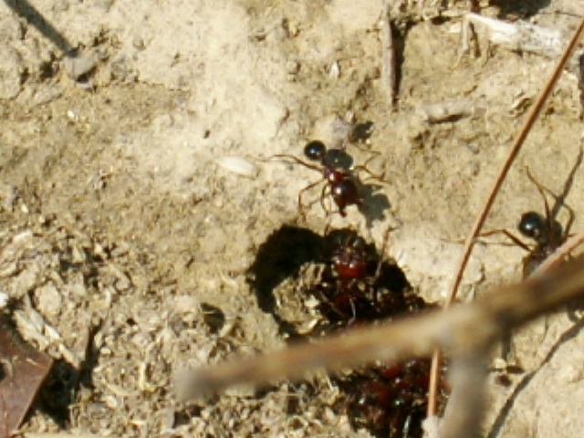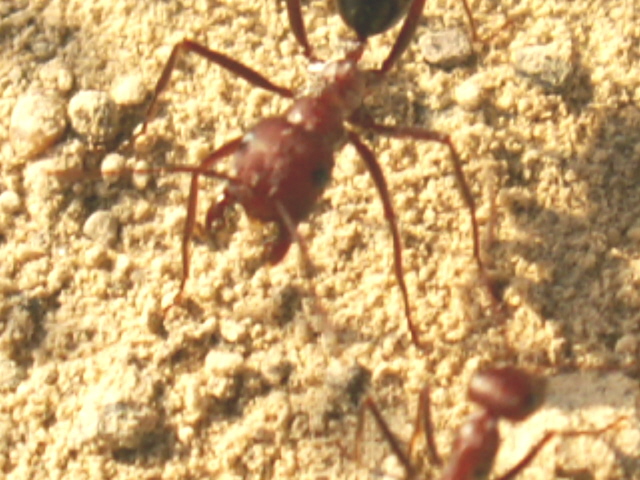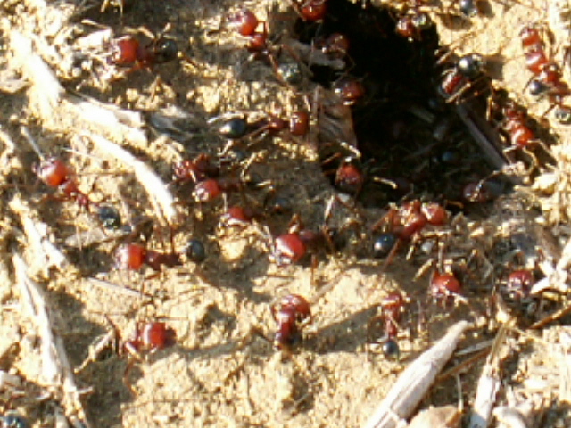 Ernteameisen sind ebenfalls nicht selten. Von einer besonders schönen Art mit ziegelroten Kopf und