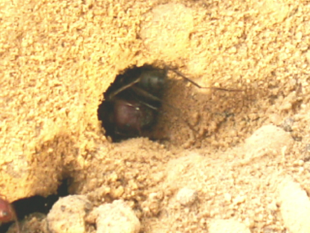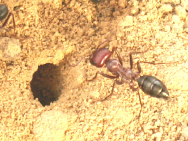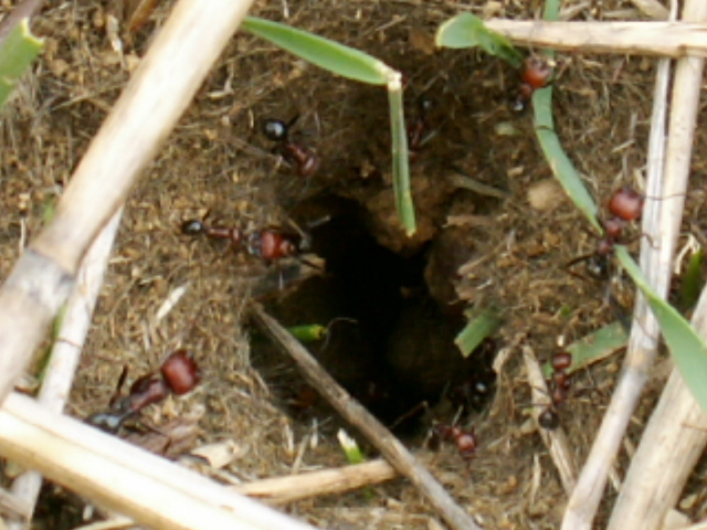 Nesteingang der Roten zu sehen, sie wird von den roten Majorarbeitern zurückgewiesen.