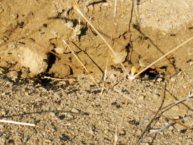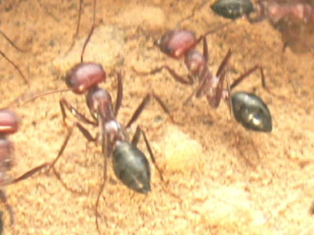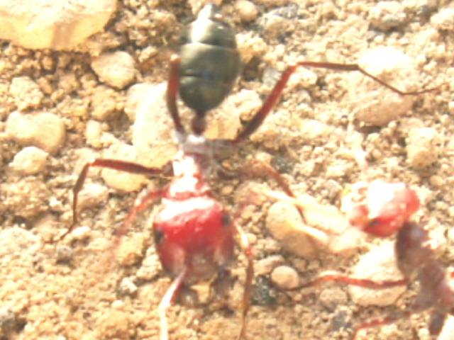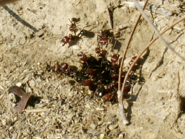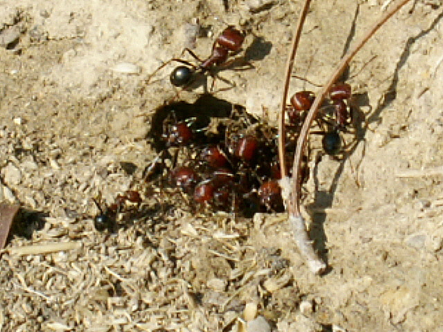Zwischen den Messor-Arten kommt es ständig zu Geplänkeln, die grossköpfigen roten Messor bewachen dann die Nesteingänge dichtgedrängt. Auf einem der Fotos ist der Angriff einer dunkleren Arbeiterin einer anderen Art auf einen