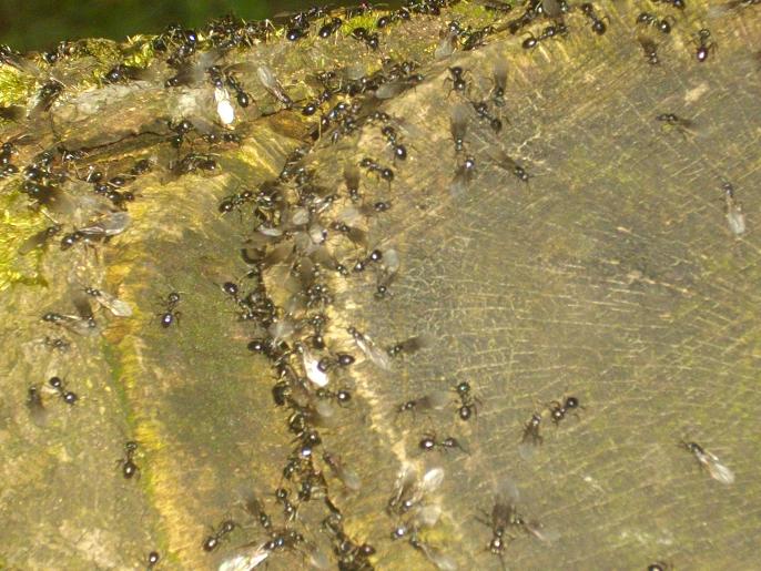 Die abgebildeten Ameisen sind leider so klein dargestellt u. man kann auch nicht zoomen. Der schemenhaft erkennbare Habitus könnte aber zu Lasius fuliginosus fĂŒhren. Die schwĂ€rmen heuer sehr frĂŒh und sind bereits "unterwegs"!
