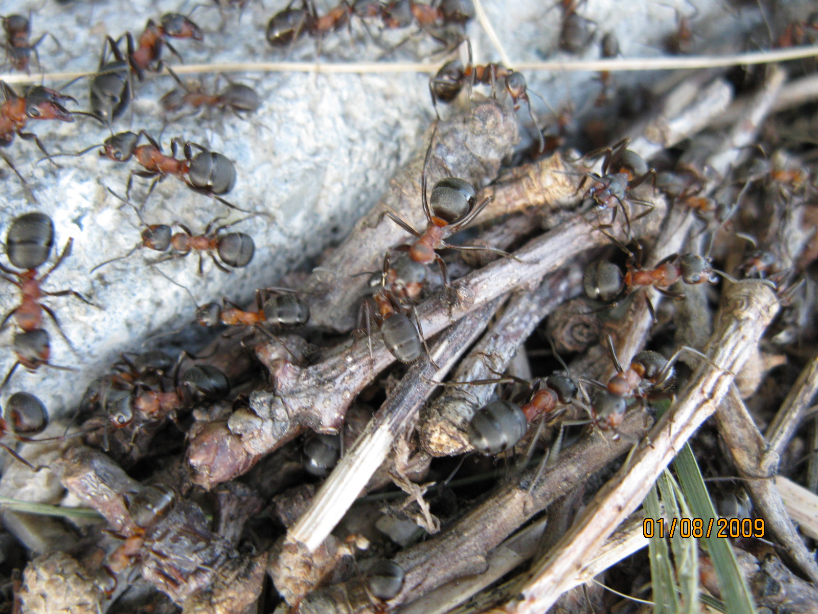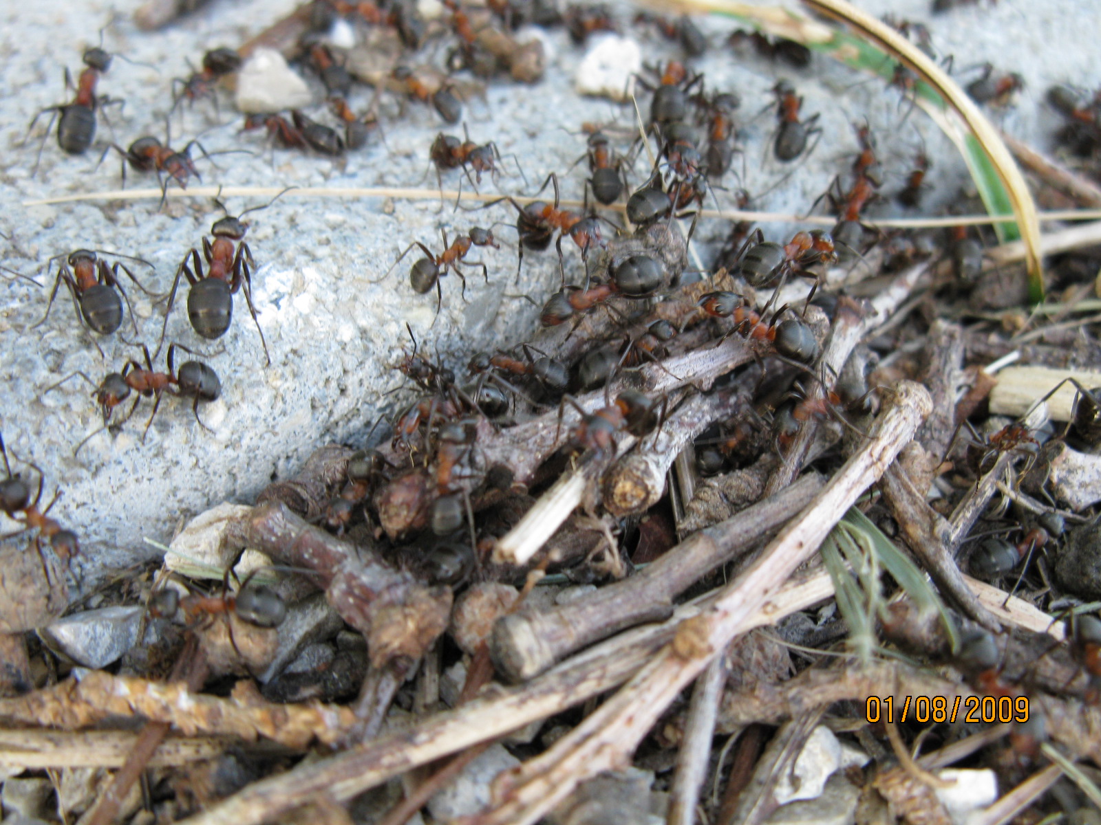 Neben den unseren Gastgeber bekannten Nestern fanden wir ein weiteres Nest dieser beeindruckenden Ameisen, außerdem fanden wir Nester von Ponera coarctata. Uns wurde ein recht untypisches Nest von Formica rufa gezeigt, die Tiere siedelten unter Gehwegplatten, die vor einer Rastbank verlegt waren.