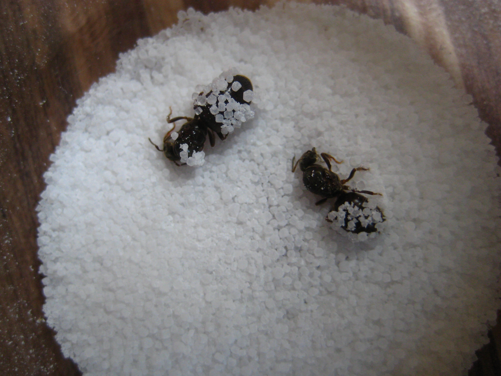 Nach ca. 20min zeigten sie die ersten Lebenszeichen, in Form von einem Beinzucken, ich befreite sie also vorsichtig mit einer Nadel vom restlichen Salz. Ich verteilte es anfangs auf den ganzen Körpern, da die Ameisen wirklich nass waren.