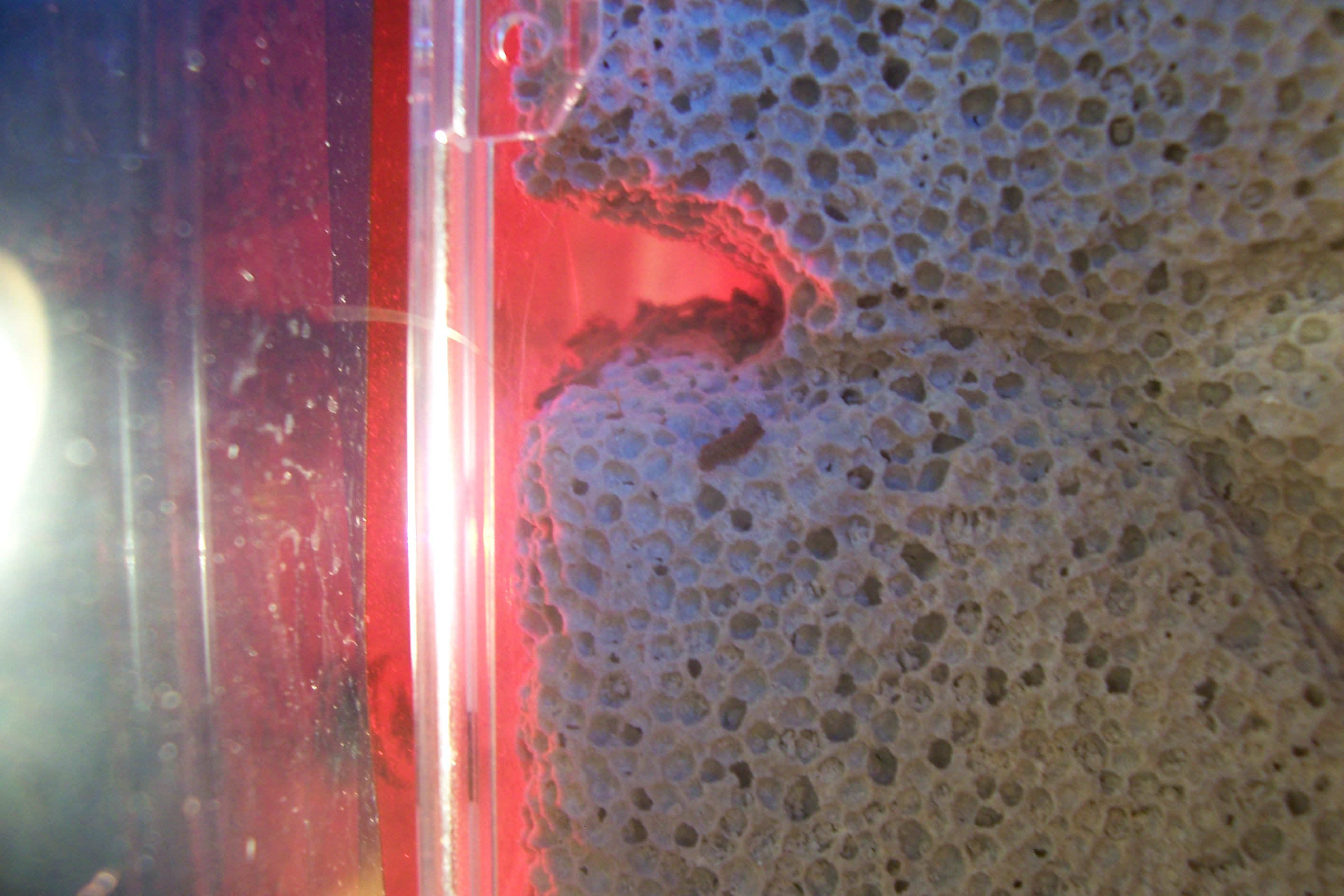 Um den Umzug zu beschleunigen und ggf. das Nest attraktiver zu machen, schalte ich eine Schreibtischlampe für ca. 2 Stunden pro Tag an. Ich habe eigentlich nicht damit gerechnet, dass es einen sofortigen Umzug aus dem RG in den YTong geben wird, zumal das Reagenzglas ja noch genug Wasser für die nächsten Wochen übrig hat.