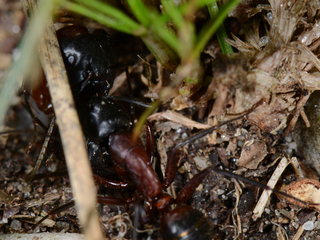 Camponotus war auch vertreten. Eine Major-Arbeiterin soll getragen werden... passierte natürlich genau, als ich gerade weiter wollte, da hatten sie es leider schon fast ins Gras geschafft.