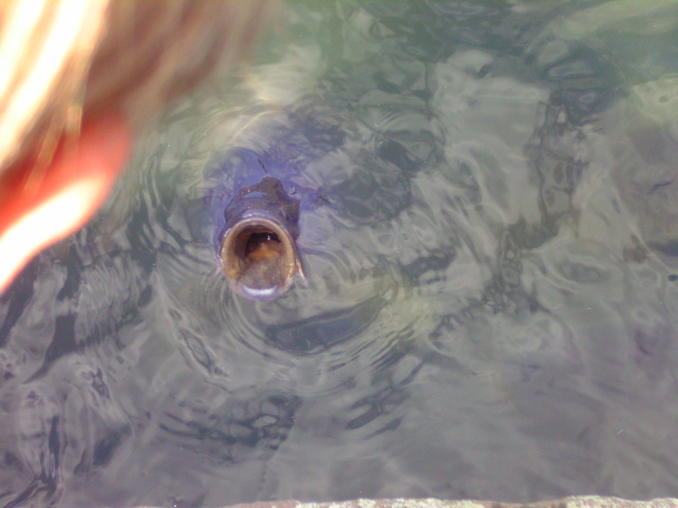 Bild 9: Dieser bildschöne Spiegelkarpfen hat mĂ€chtig hunger. Ich habe mich mal ĂŒbers GelĂ€nder gebeugt und ihm meinen Finger ins Maul gesteckt. Er merkte relativ schnell, dass ich nicht essbar bin.