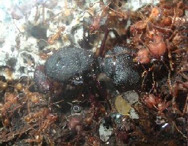 - Das war auch mal eine besondere Erfahrung. Oecophylla smaragdina sind imposante Tiere, sehr wiff und flink. Allerdings bekam ich eine Kolonie mit einer Gyne, deren meisten Beine fehlten, am Rücken lag, und daher nicht lange lebte. Da hatte ich wohl "die Katze im Sack" gekauft - die Kolonie kam in einem Blattnest ohne Einsicht.