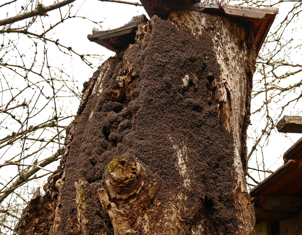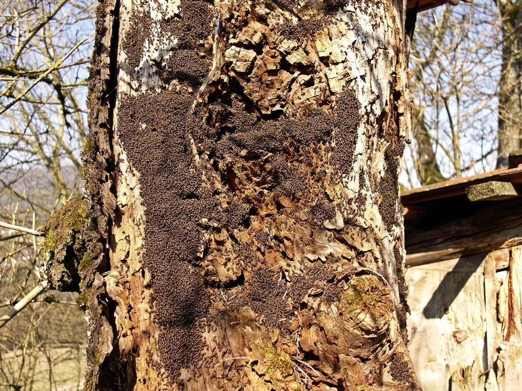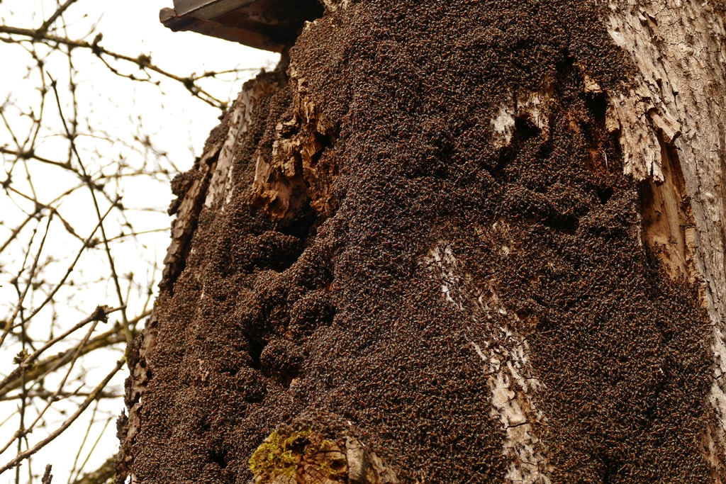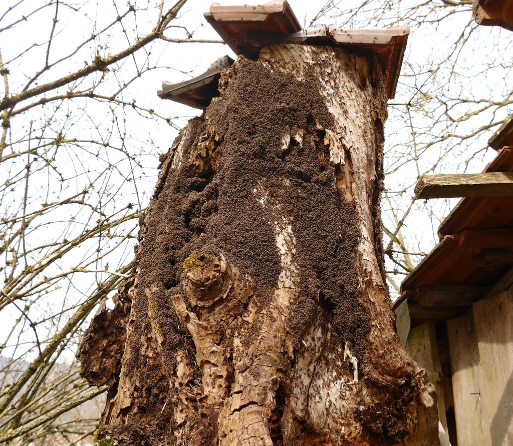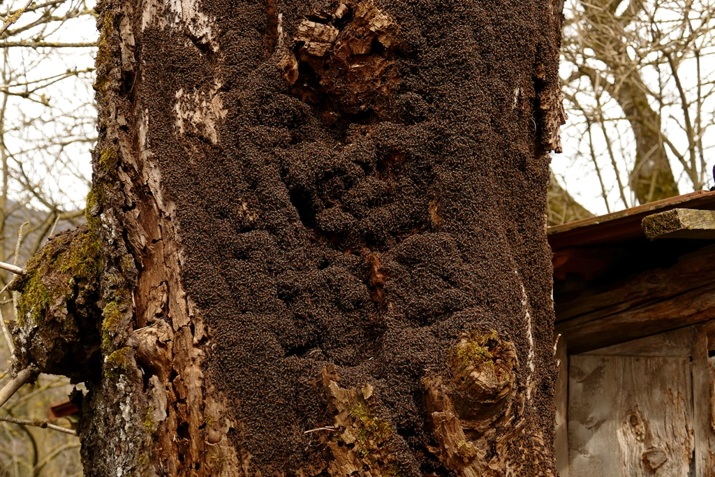 Einige Tage lang kommen die Ameisen bei Sonne und WĂ€rme heraus und sammeln sich. Am Nachmittag sind sie wieder im Stamm.