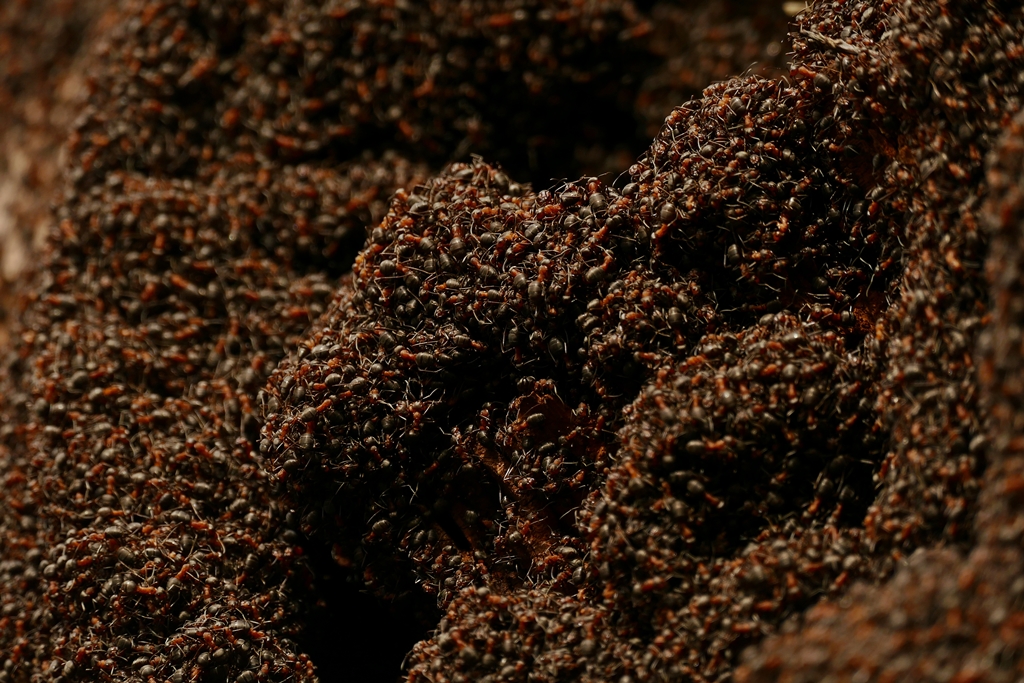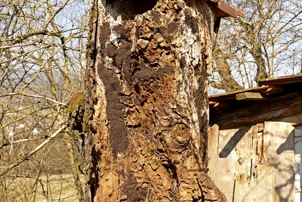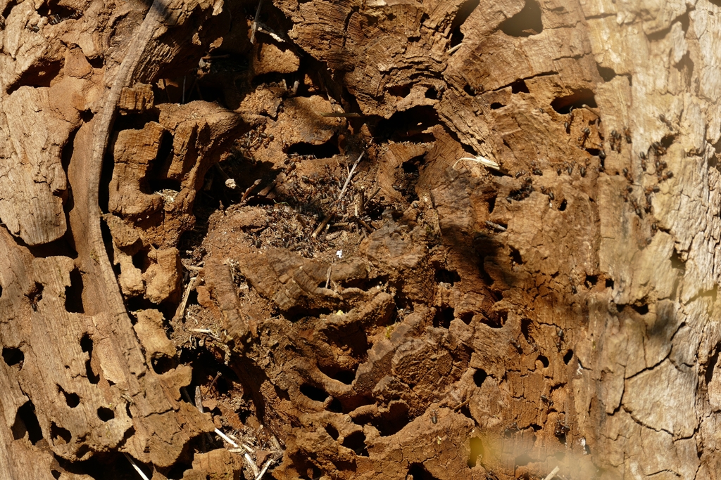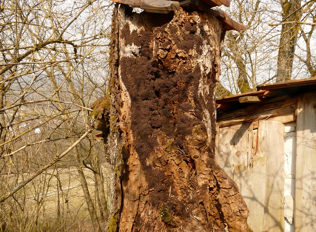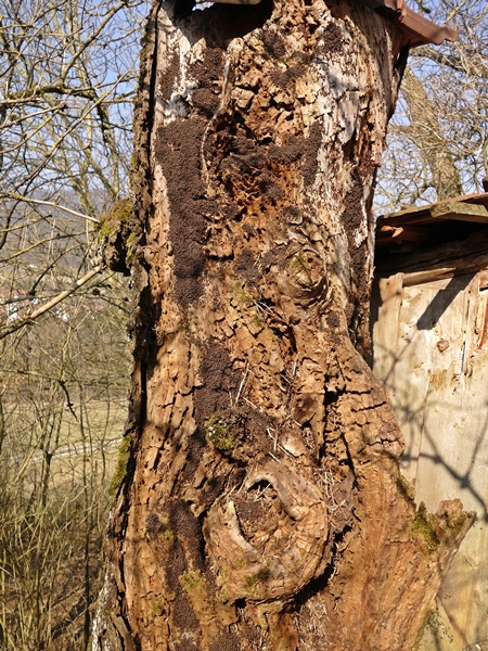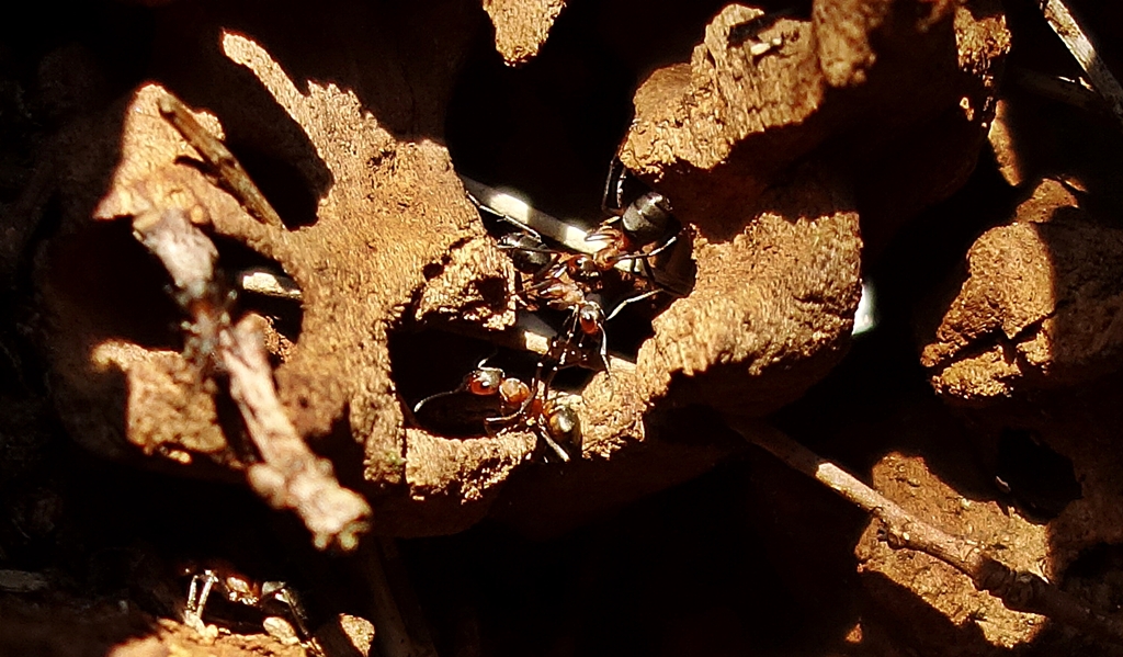Einige Tage lang kommen die Ameisen bei Sonne und WĂ€rme heraus und sammeln sich. Am Nachmittag sind sie wieder im Stamm.